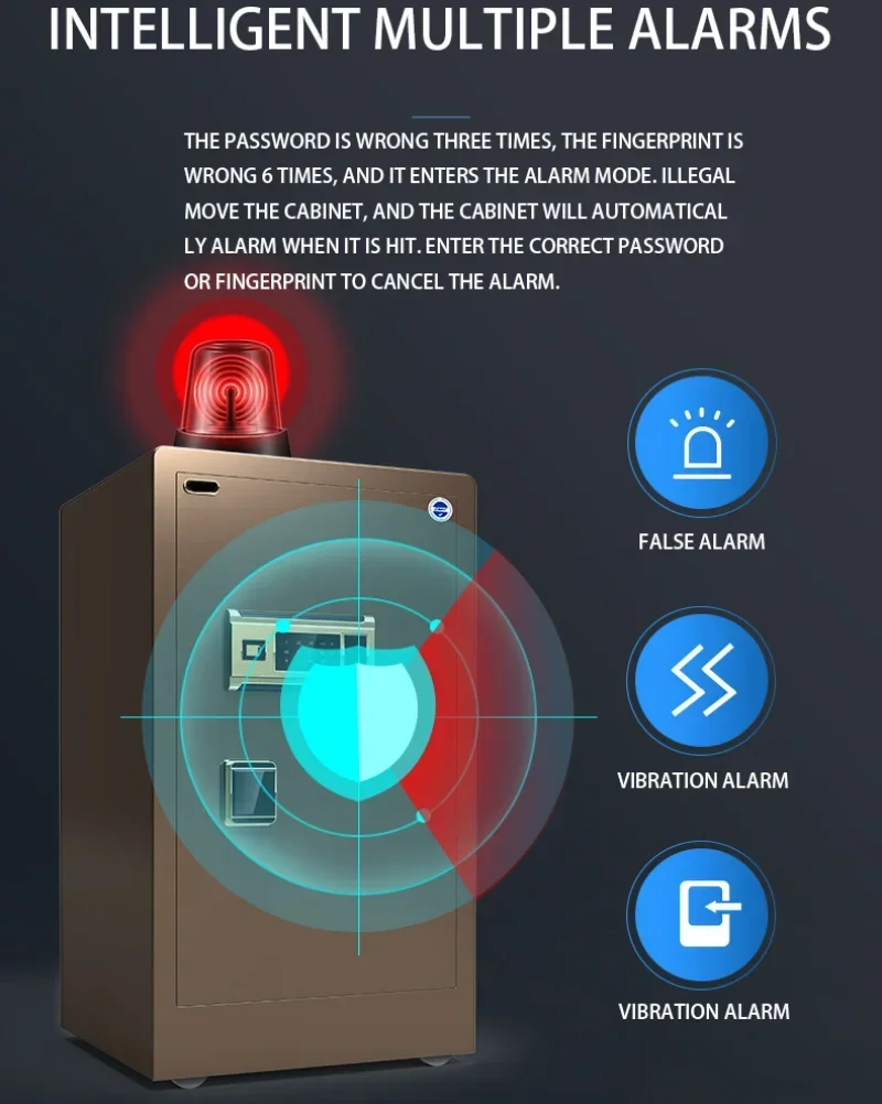 If the password is wrong three times and the fingerprint is wrong 6 times, it will enter the alarm mode, and the box will automatically alarm if it is illegally moved or hit. Input the correct password or fingerprint to cancel the alarm.