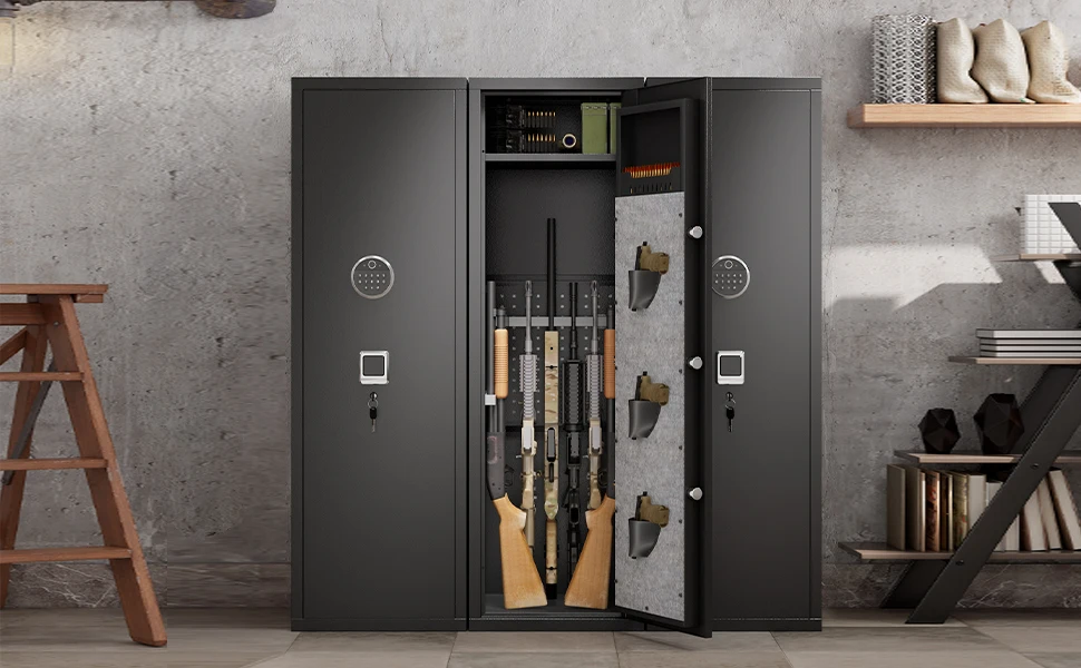 - 【10-15 High Capacity Gun Cabinet】This gun cabinet is constructed with the latest design and can hold 10-15 rifles, shotguns inside, as well as having 3 handguns in separate storage and 1 ammo storage space.