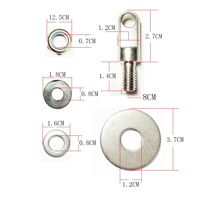 Locking Hardware for Steel Ammo Can Instructions: 1) Close the lid and latch of the ammo can and mark the center of the hole where the locking hardware will be installed (try to be exact!) 2) Drill a 5/16”hole into the can at the center mark (drilling out a smaller guide hole beforehand may be helpful) 3) Form the outside of the can,insert the locking stud through the drill hole 4) On the inside of the can,put the neoprene washer over the threads of the locking stud,followed by the small washer,and then the nylon lock nut.Tighten the assembly with a wrench,being aware that the “round” side of the locking stud may have sharp edges/burs,so a tool should be utilized on”round”side,not bare hands 5) For ammo cans with large holes,put the large washer between the ammo can’s latch and the padlock in order to prevent the large latch hole from slipping over the padlock -If you finshin the assembly and find the locking stud is not centered,simply file or drill the ammo can’s latch holes to be larger until the latches properly fit the locking stud You will only get the accessories in the picture below, others are not included