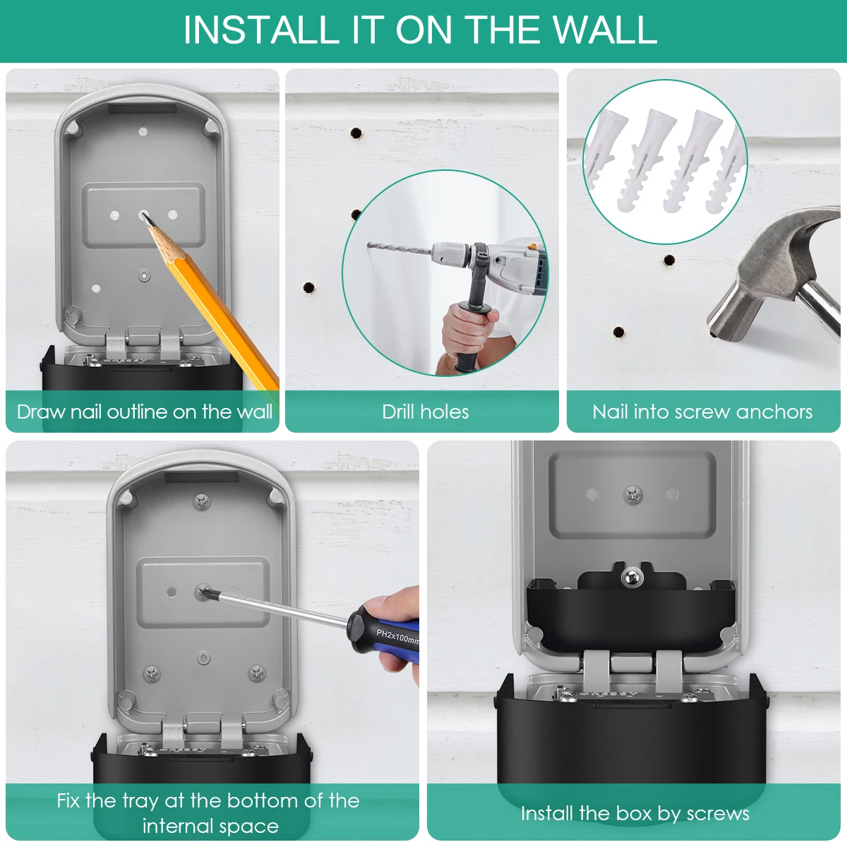【Material】 Includes a wall mounting kit containing all you need to easily and conveniently fit the key box to a discrete outside location; detailed instructions & key hook included. Made of zinc alloy and heavy-duty steel, which can protect the box from hammering, sawing or prying.