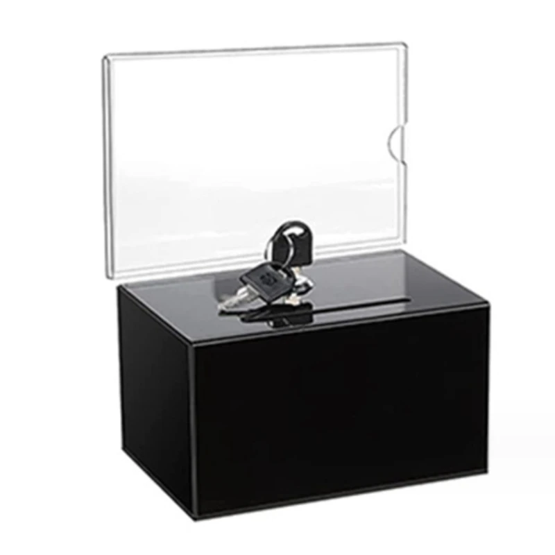 Black Acrylic Box --- Black acrylic design with clear transparent 4.5 inch x 6.25 inch display stand for complete privacy when you use the box to store your money/suggestions/ballots. And the display bracket can be replaced according to different uses.
