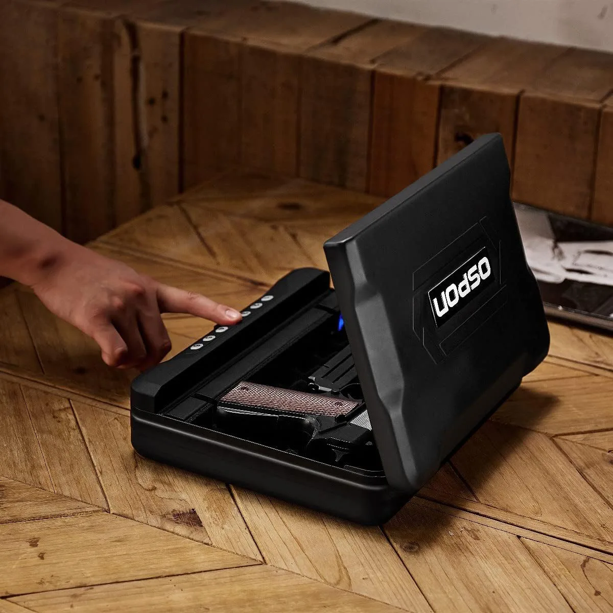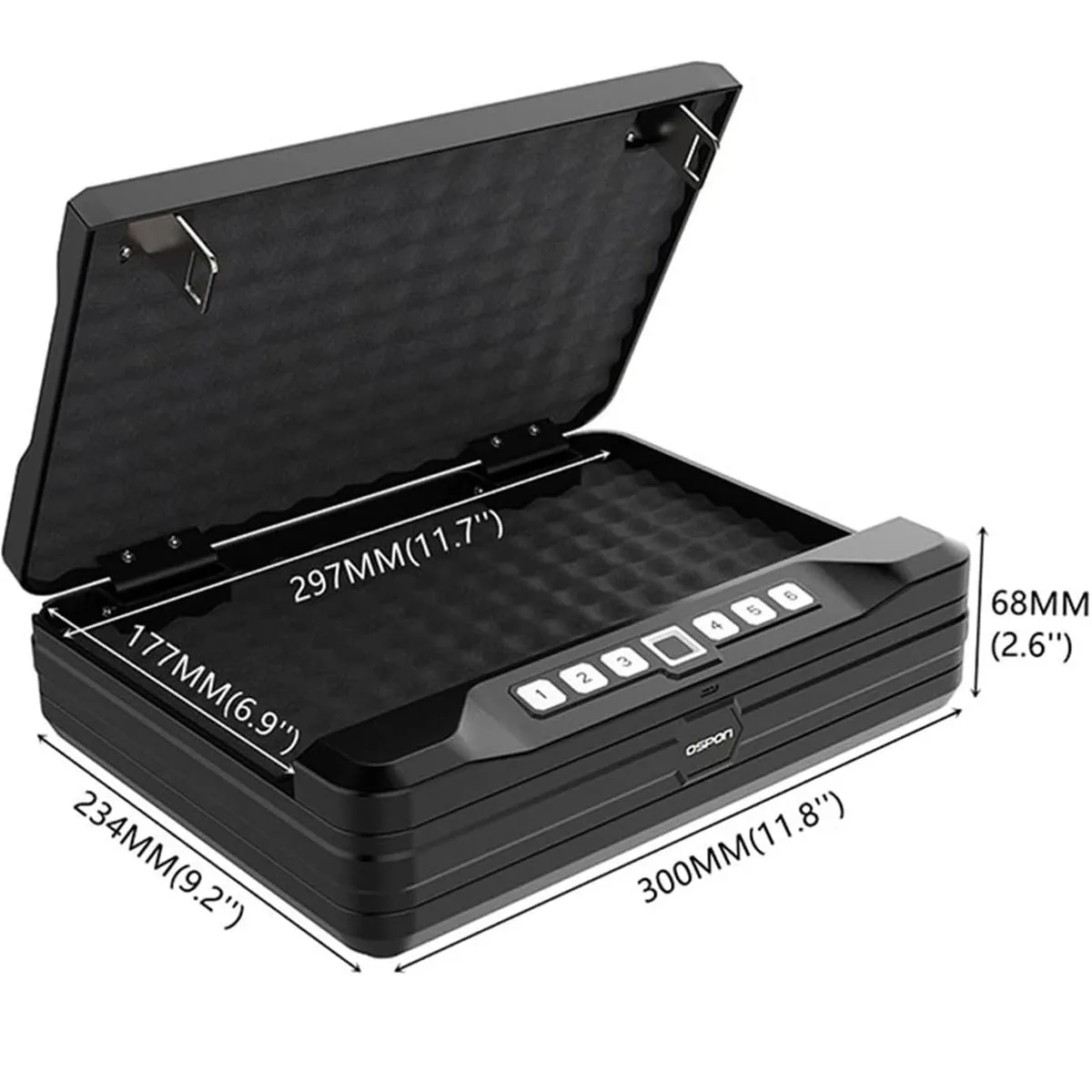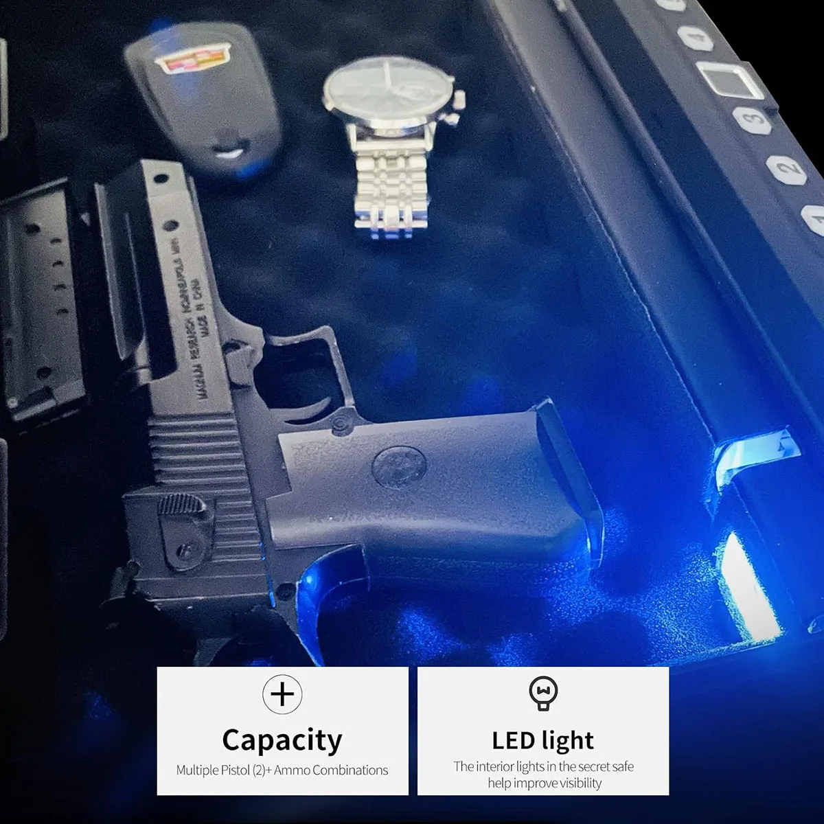 This biometric gun safety accessory is equipped with a high-precision fingerprint identification chip that instantly recognizes fingerprints. Upgraded Pistol Safe The pistol safe says goodbye to unsightly hydraulic struts that take up space. Equipped with a professional hinge and LED light, it can quickly bounce up to 80°, quiet, fast, and convenient for quick access to the pistol.