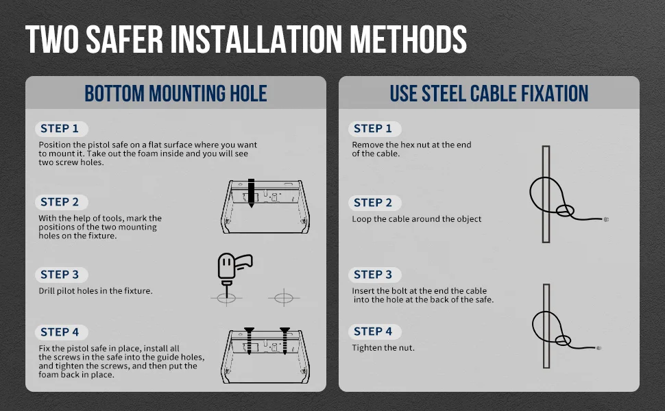 Built with solid alloy steel and featuring a pry-resistant door, this bedside gun safe offers high-strength security to keep your firearms safely stowed away from unauthorized access. Features two pre-drilled holes and a sturdy steel cable for mounting, ensuring maximum protection against theft and intrusions. Feel safe wherever you install your firearm safe.