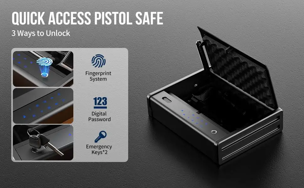 Engineered with advanced SWISS FPC Semiconductor Fingerprint Recognition Technology, this gun safe ensures immediate access to your firearm in just 0.1s, providing security when you need it most. The pistol gun safe can store up to 20 user fingerprints for access by multiple users.