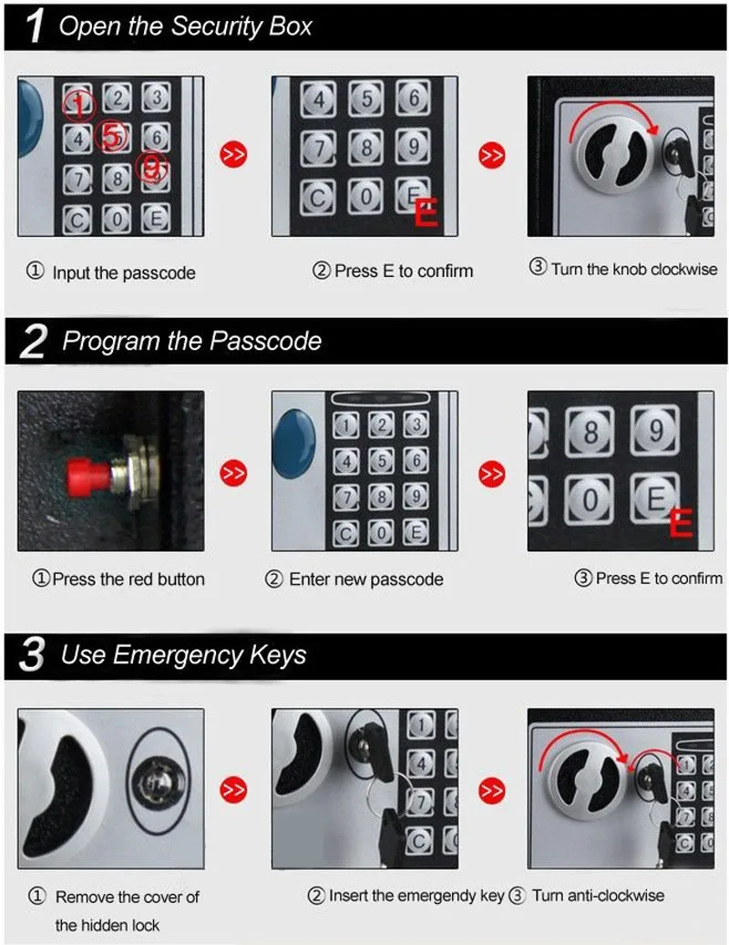 Product Description 0.8/1.7/2.1Cubic Feet Safe Box This safety box features a 0.8/1.7/2.1 cubic feet storage capacity and reliable lock systems. You can securely and quickly access the safe with a key, fingerprint, digital code, or fingerprint & digital keypad. It