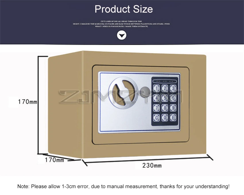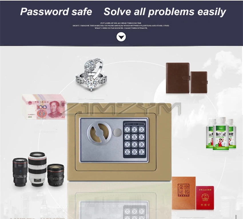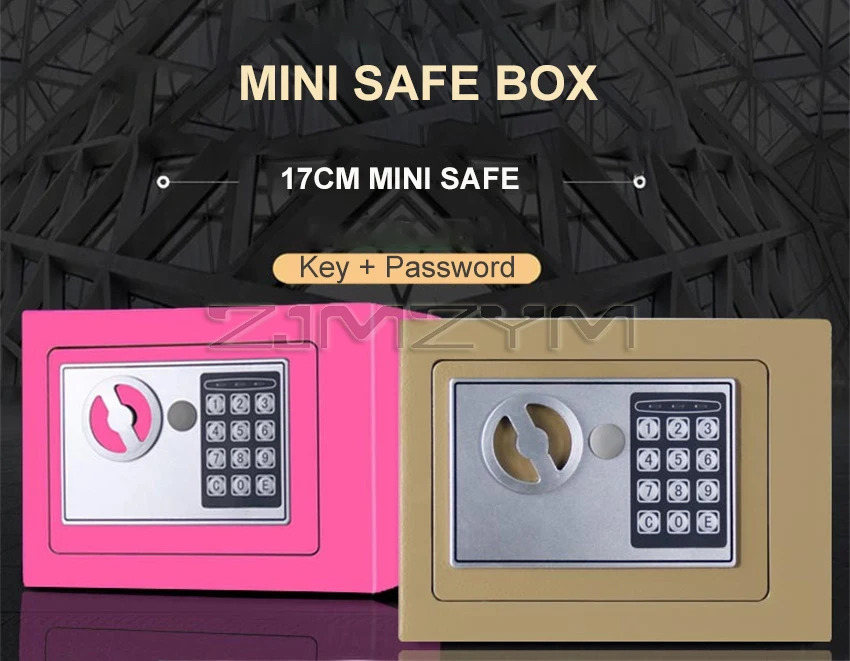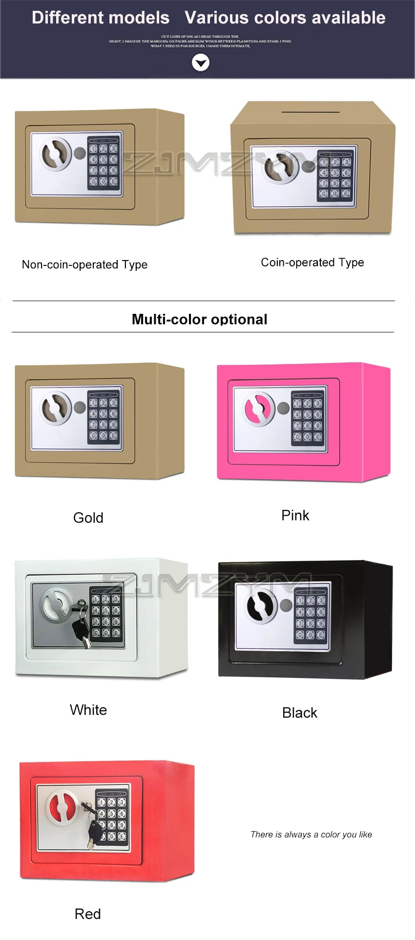 Name: Mini SafeMaterial: All SteelColor: Tyrant Gold/Pink/White/Black/RedExternal dimensions: height 170* width 230* depth 170mmInternal dimensions: height 160* width 220mmNumber of lock heads: 2Open method: password + knob or emergency key + password + knobProduct accessories: emergency key, manualType:Type A: Non-coin-operated TypeType B: Coin-operated Type
