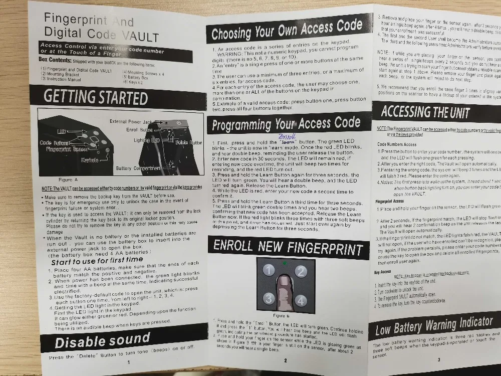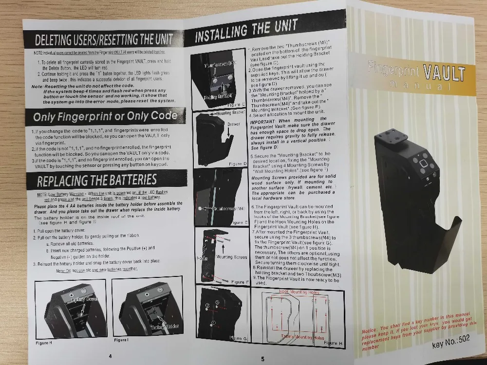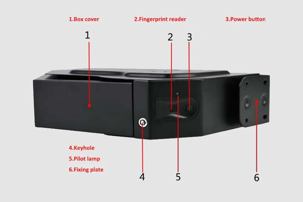 - 断电保护,当保险箱突然关机时,保存指纹会被保存并继续使用