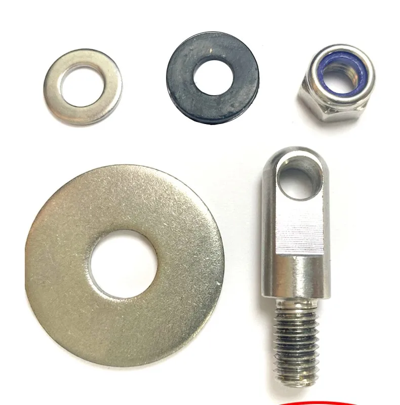 4) On the inside of the can,put the neoprene washer over the threads of the locking stud,followed by the small washer,and then the nylon lock nut.Tighten the assembly with a wrench,being aware that the ''round'' side of the locking stud may have sharp edges/burs,so a tool should be utilized on''round''side,not bare hands