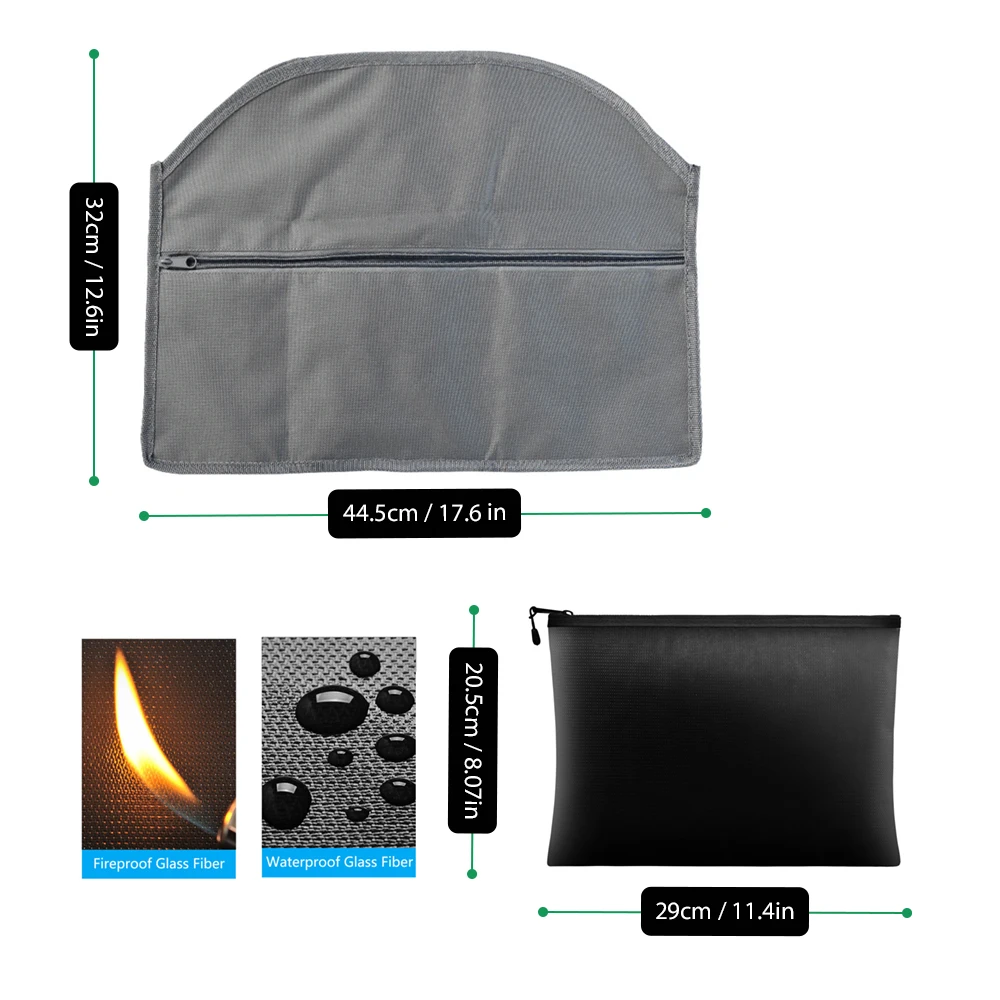 Descriptions: The Fireproof Bag is made of dual-layered high-quality non-itchy silicone coated fiberglass which stands up to the temperature of up to 1022℉. It will protect your documents and valuables from damage in case of fire. Features: 1. Double Protection: Silicone coating on the outside, provides a fireproof and water-resistant