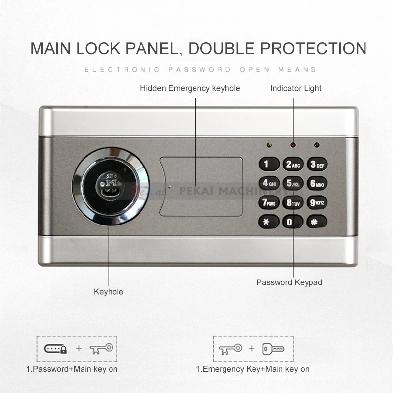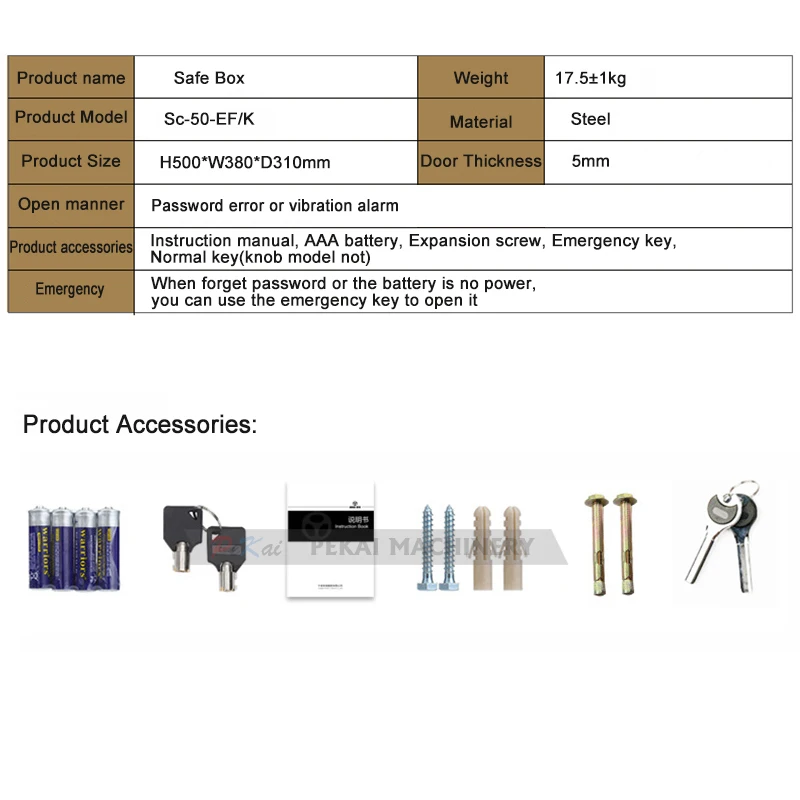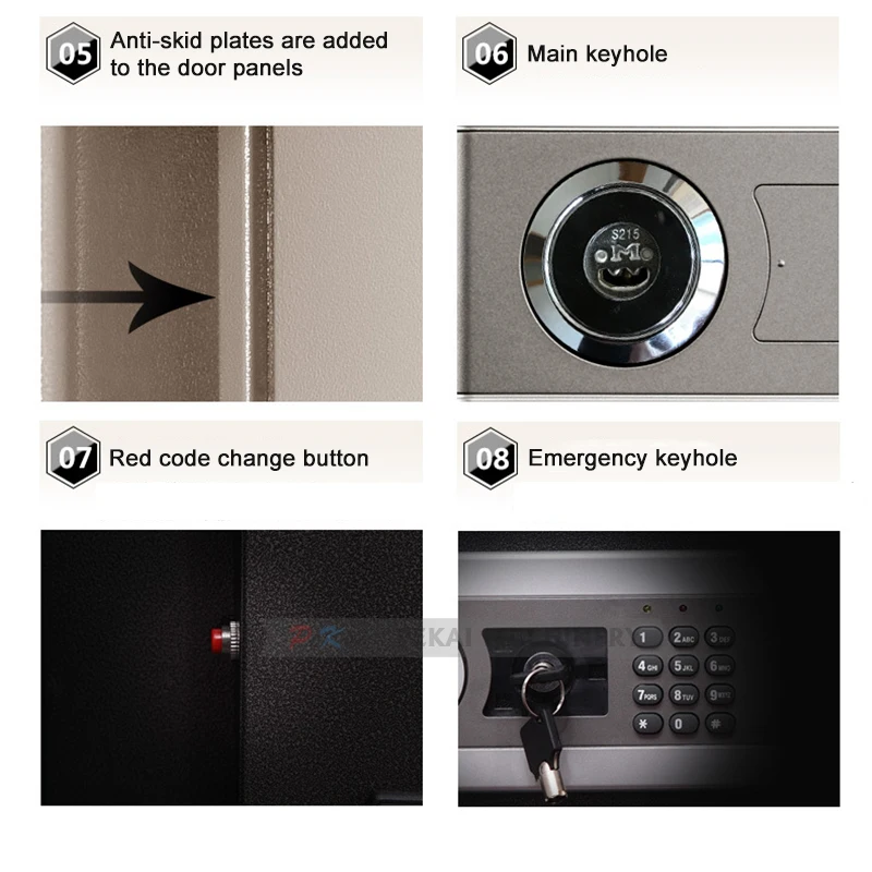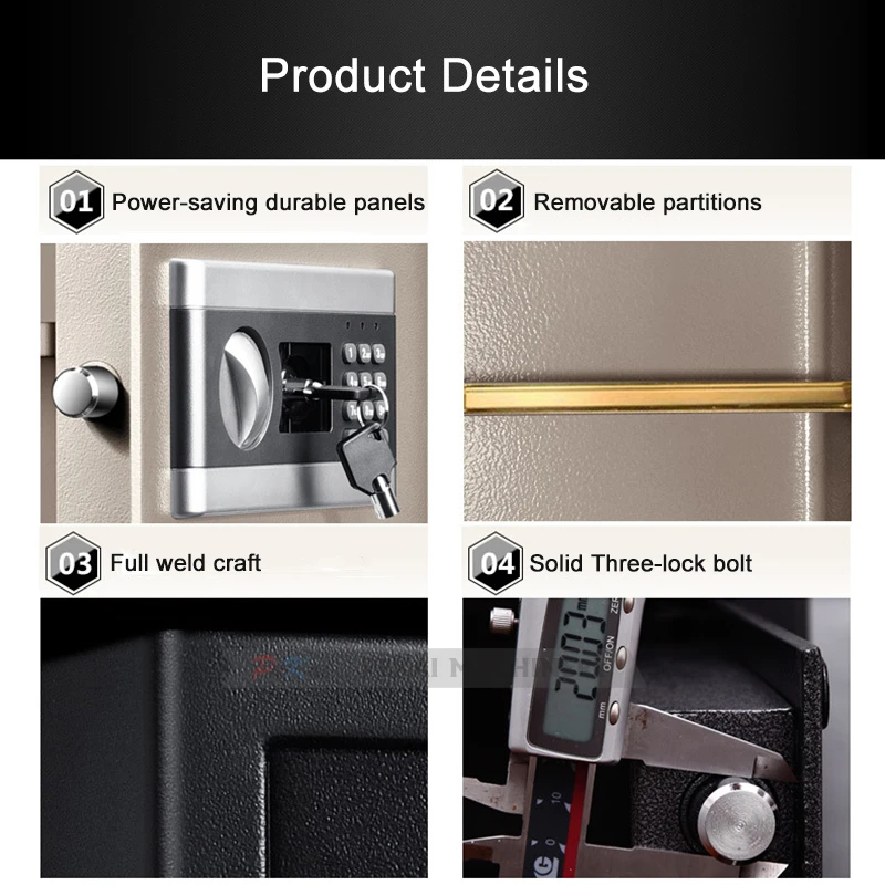 Product Description 0.8/1.7/2.1Cubic Feet Safe Box This safety box features a 0.8/1.7/2.1 cubic feet storage capacity and reliable lock systems. You can securely and quickly access the safe with a key, fingerprint, digital code, or fingerprint & digital keypad. It