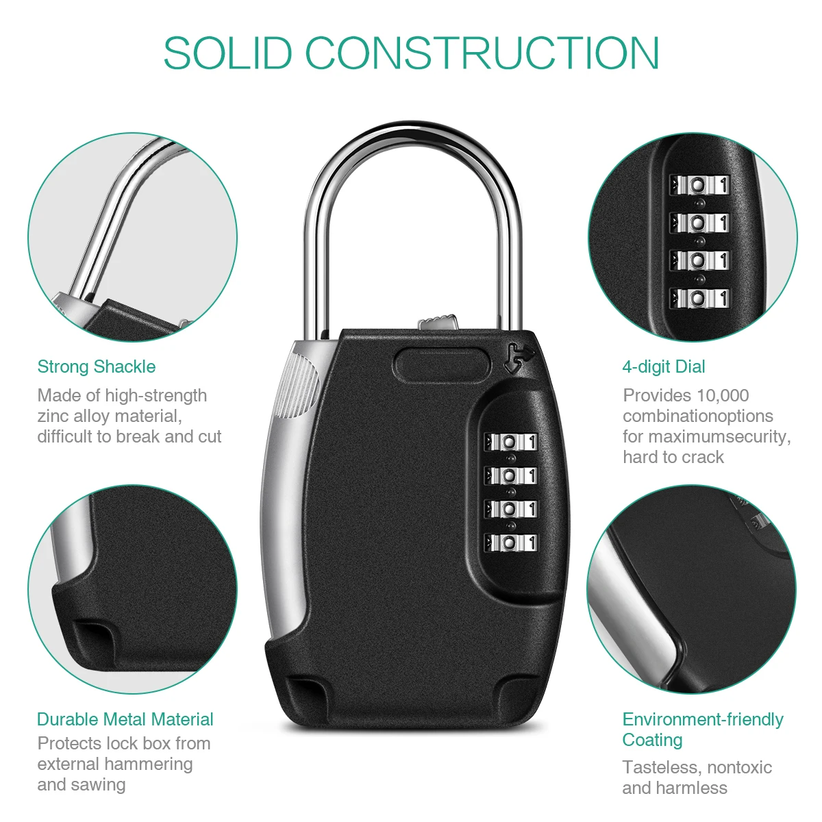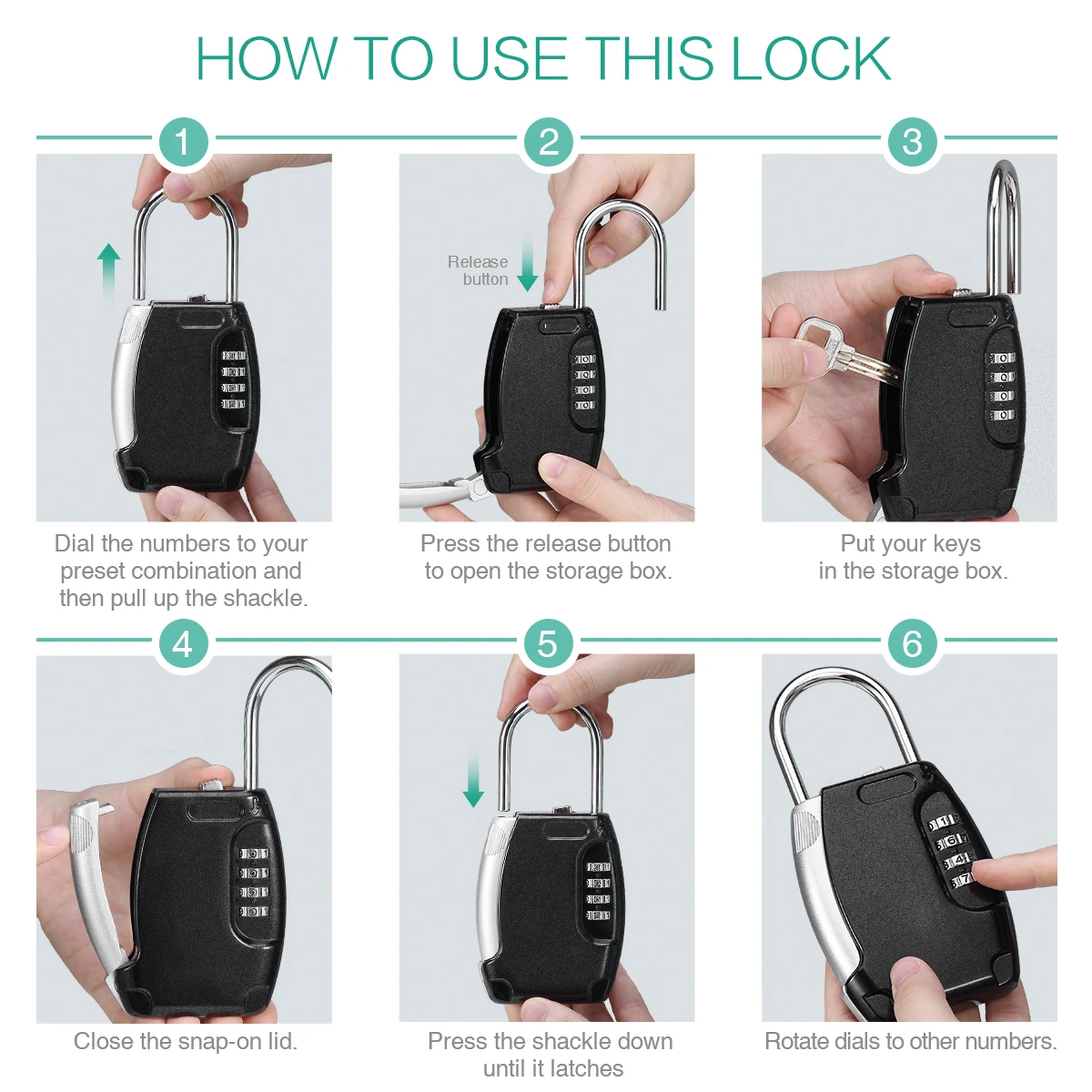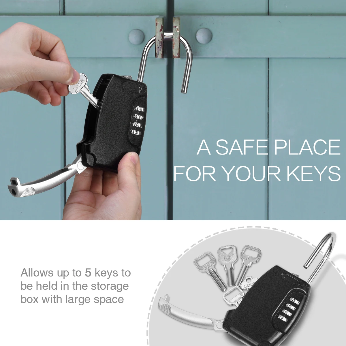 【 Large Capacity】: The box has a large inside space is enough to storage up to 5 keys. You can also alter to storage a car key, credit card, USB thumb drive and so on.【 Wide Applications】: The key box can be used in many areas. Suitable for indoor and outdoor use like doorknob, metal fence, railing, emergency entry, vacation home, pet sitters, etc. No tools needed.【 Durable Material】: High strength zinc alloy body and hardened steel shackles, offer extra resistance to cutting and sawing. It is harmless to the human body. These construction makes this lock box strong, sturdy, durable and anti-rust.【High Security】: 4 digit combination lock box allows you to set your own combo code with 10000 unique choices. It is more secure than key locks.How to Set Password?1. Use the original passcode 0000 to open.2. Rotate shackle 90 counter-clockwise.Press down and hold shackle3. Then set the code you like.Return shackle to locked position.Package Including:●1 x Key Storage Box●1 x User Manual