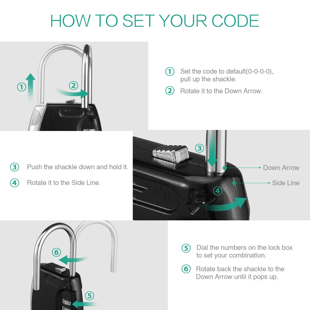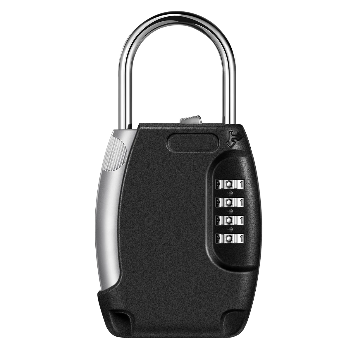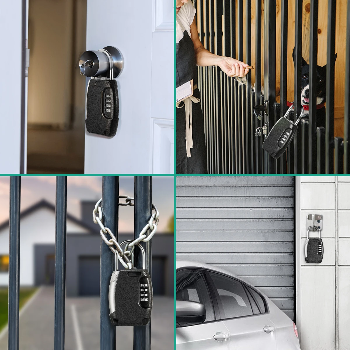 【 Large Capacity】: The box has a large inside space is enough to storage up to 5 keys. You can also alter to storage a car key, credit card, USB thumb drive and so on.【 Wide Applications】: The key box can be used in many areas. Suitable for indoor and outdoor use like doorknob, metal fence, railing, emergency entry, vacation home, pet sitters, etc. No tools needed.【 Durable Material】: High strength zinc alloy body and hardened steel shackles, offer extra resistance to cutting and sawing. It is harmless to the human body. These construction makes this lock box strong, sturdy, durable and anti-rust.【High Security】: 4 digit combination lock box allows you to set your own combo code with 10000 unique choices. It is more secure than key locks.How to Set Password?1. Use the original passcode 0000 to open.2. Rotate shackle 90 counter-clockwise.Press down and hold shackle3. Then set the code you like.Return shackle to locked position.Package Including:●1 x Key Storage Box●1 x User Manual