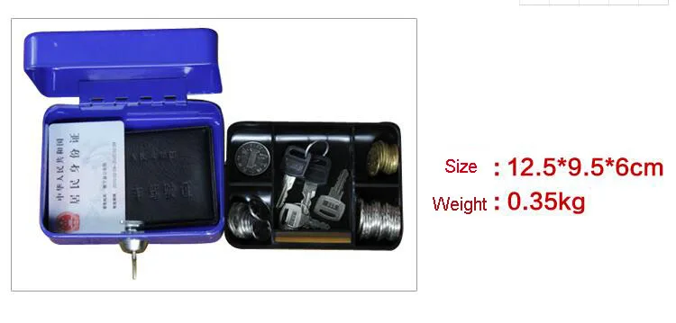 Material: Steel + Plastic Product Type: Cash Box Opening method: key Function: Anti-theft and fire prevention Color: blue / red / black Size:125*95*60mm 150*120*80mm 200*160*90mm 250*200*90mm Note:all size data are measured manually, there are certain errors