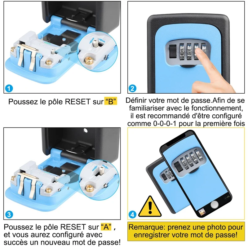[4-Digit Combination Dial]allows you to customize your own access code. Hinged lid for one-handed use. The instruction guide allows you to reset your access code at any time. (Note: After the password is reset, it's better to take a photo to save otherwise no method to open it if you forget the password)