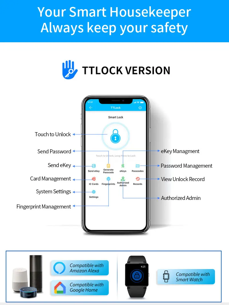 Connectivity Bluetooth 4.0, WiFi (Gateway Bridge is required for ttlock)