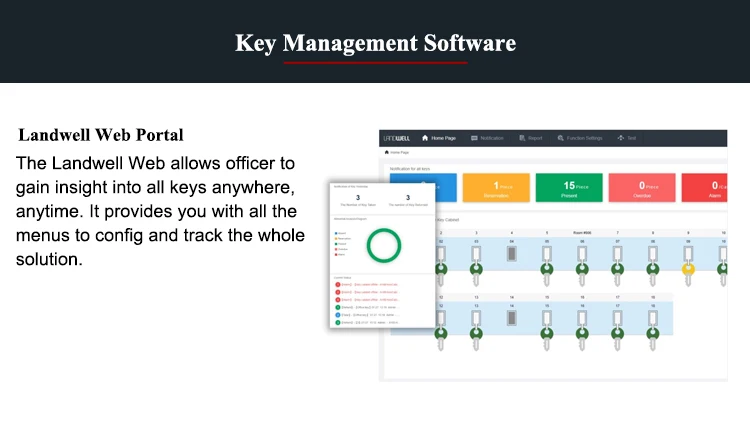 The Landwell Web allows administrators to gain insight into all keys anywhere, anytime. It provides you with all the menus to config and track the whole solution. Mobile responsive user-friendly web application that provides complete control of the key management systems in a versatile way, allowing for growth of a network of cabinets and valuable analytics on the go. View real time data relative to users and keys through events, bookings and alarms. Take care of user management, key & item tracking, reporting, analytical data, and bookings.
