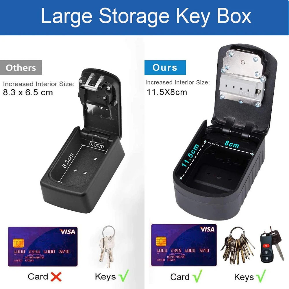 Combination key lock box outsize is 13(L)*8.5(W)*4.7(H)cm, Inner size is 12(L)*8(W)cm, one-third larger than the general wall key safe lock on the market, can arrange multiple keys or your spare key, credit card, cash, car key ect. More secure the key than put the key under the doormat or under a stone, a keys lock box can make your key safe.