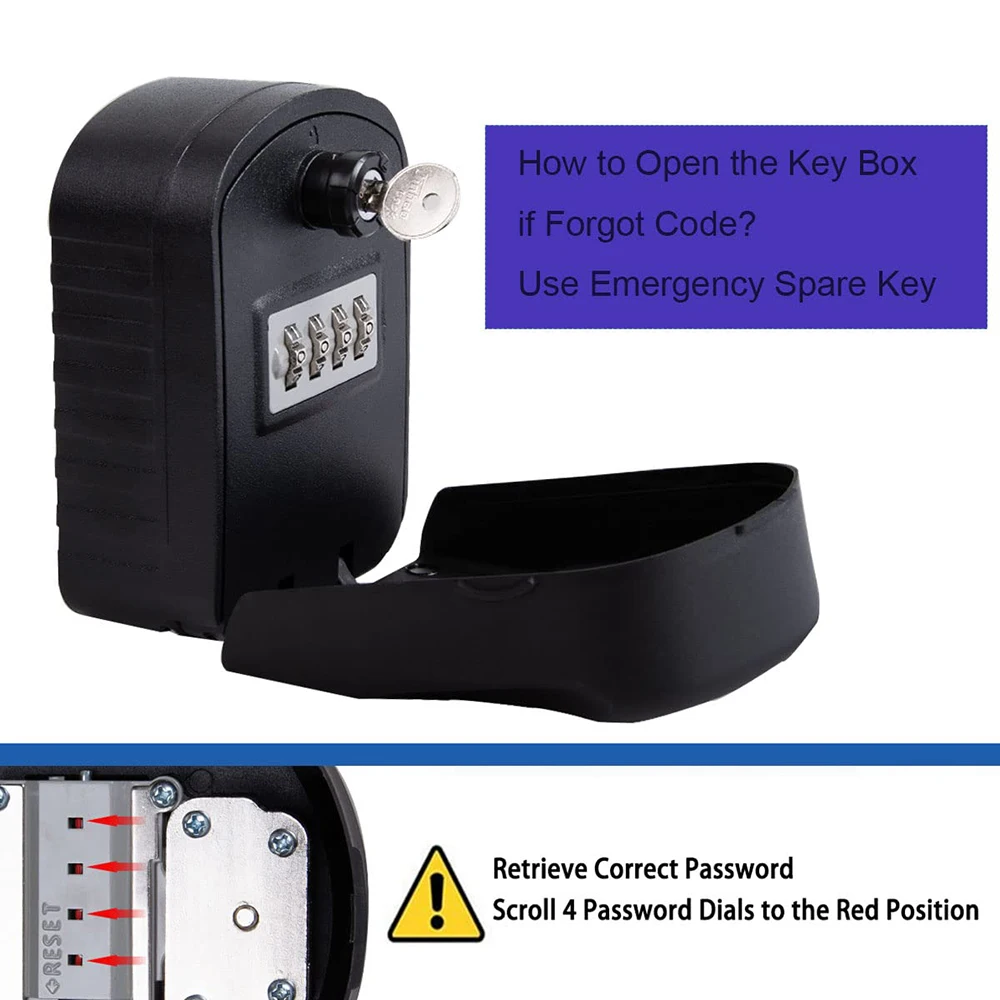 Key safe box outdoor and indoor use 4-digit combination code offers 10000 possible combinations to ensure robust protection; The original combination is "0-0-0-0", it would be nice to reset the code upon receipt. Heavy-duty steel locking mechanism and zinc alloy cast body to resist against attack from hammering, sawing or prying.