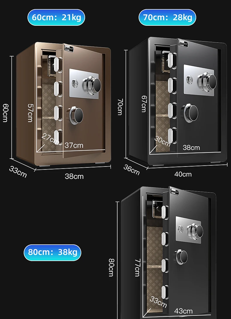 Product Description 0.8/1.7/2.1Cubic Feet Safe Box This safety box features a 0.8/1.7/2.1 cubic feet storage capacity and reliable lock systems. You can securely and quickly access the safe with a key, fingerprint, digital code, or fingerprint & digital keypad. It