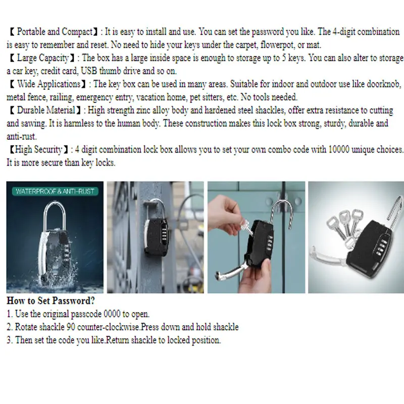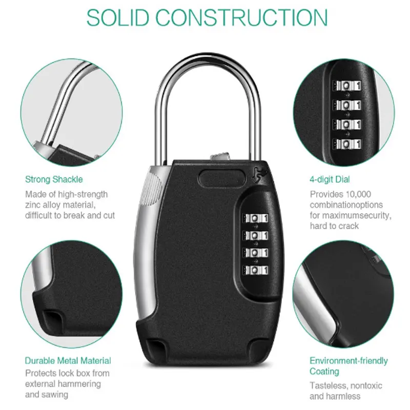 It is made of strong zinc alloy, which tough and durable, the combination lock with 4 digital code provide double secure for you keys.
