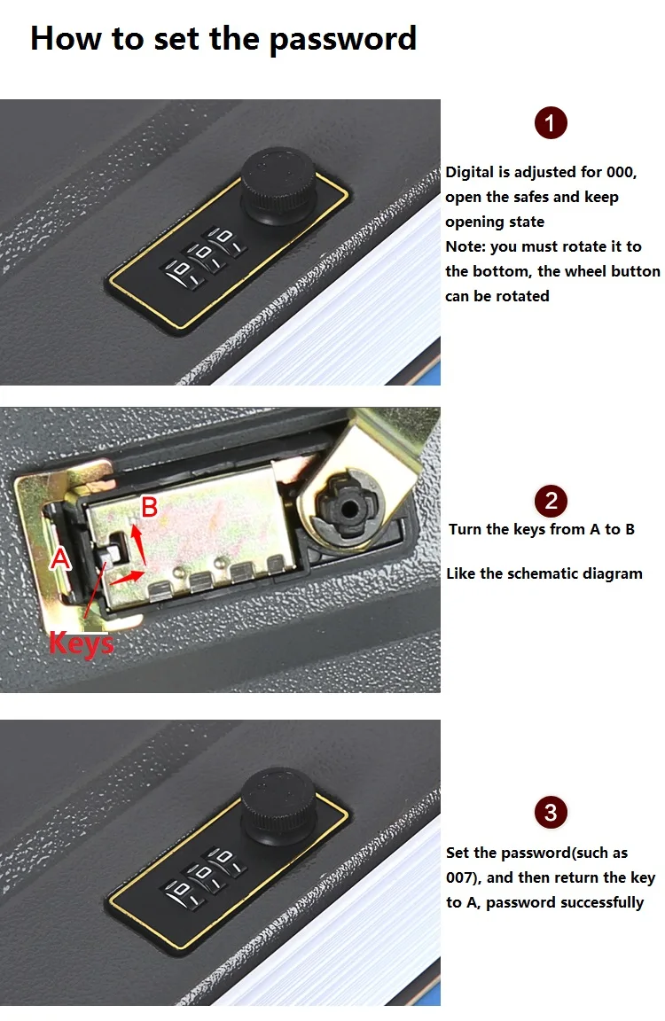 Manufacturing process: the main body is made of 1 mm cold rolled steel plate, and the surface is sprayed with plastic to prevent rust.Password product size: 240 * 165 * 55mmKey size without pattern: 240 * 165 * 55mmKey lock (with steel sleeve): 220 * 163 * 66mmWeight: 0.7kg (2kg for steel sleeve)