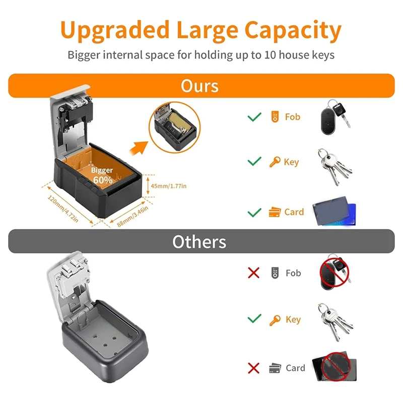Large Storage Capacity - The key lock box outside size around: 12x4x8.7cm. With a large storage space, this wall mount lock box can store up to 5 house keys or other small things like U Disk, car keys, access cards and so on.