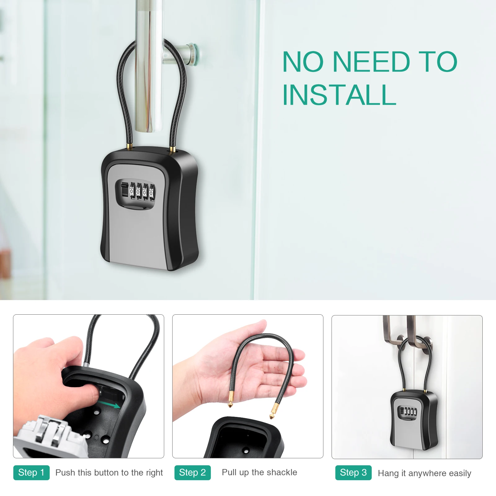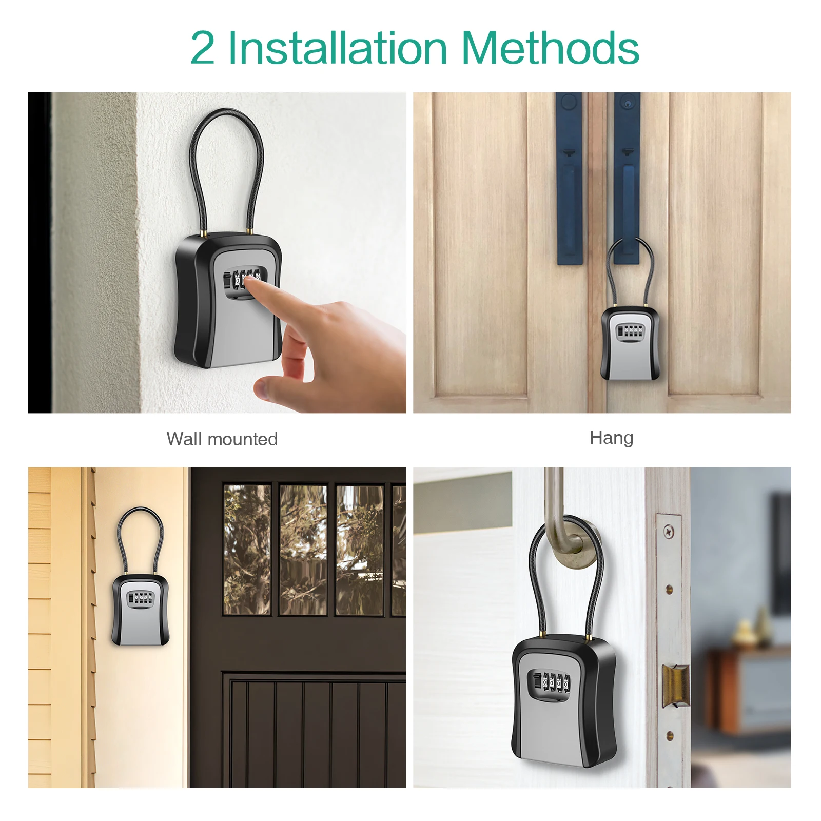 【Removable Shackle】 It is easy to install and use. You can set the password you like. The 4-digit combination is easy to remember and reset. Lock box with a removable shackle that you can hang it to different door knob or anywhere you like, or mount it on the wall..