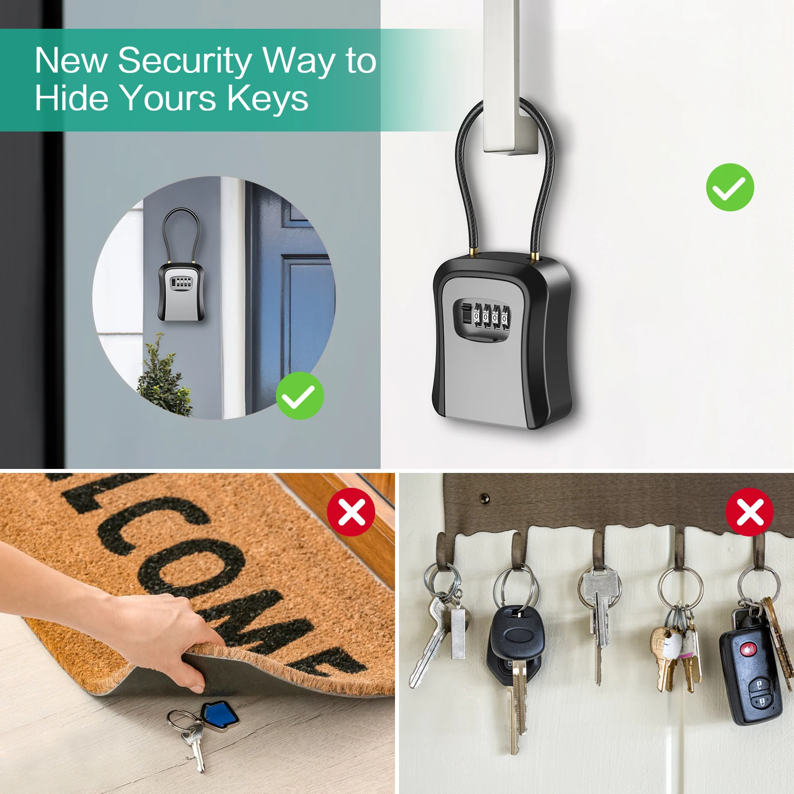【High Security】 4 digit combination lock box allows you to set your own combo code with 10000 unique choices. There is no need to hide your keys under the carpet, flowerpot, or mat. Just tell the password to your friends who allowed get into your house.