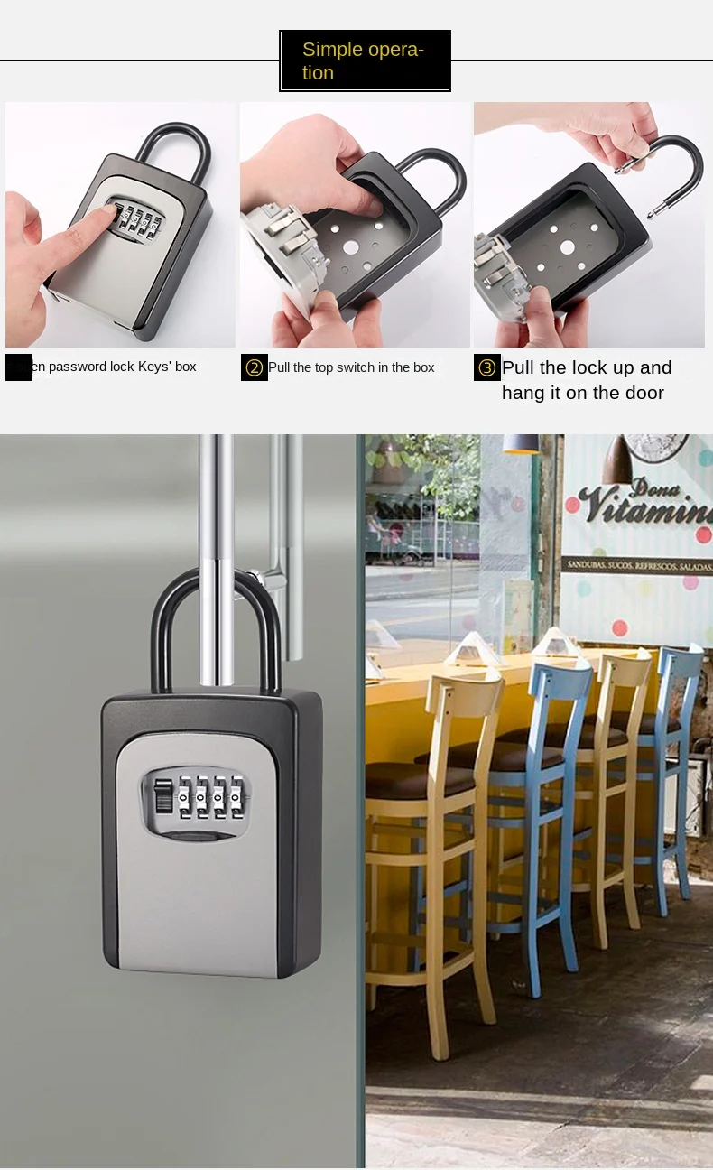 DescriptionThe item you are watching is the latest key safe with combination lock, which can store 5 keys less than 90mm in length.With this kit, you will never be locked out when you forget to take the key or lose the key.It is made of solid zinc alloy, which is strong and durable, and the combination lock with 4 digit password provides double security for your keys.Can be widely used in home, office, factory, RV, RV, etc.Main features