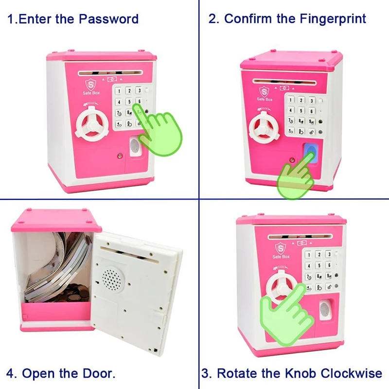 1. Electronic Password Piggy Bank: Open the Piggy Bank Requires A 4-Digit Password + Fingerprint Confirmation, The Password Can Be Set by Yourself, The Initial Password Is "0000", Press the RESET Button to Reset the Password.
