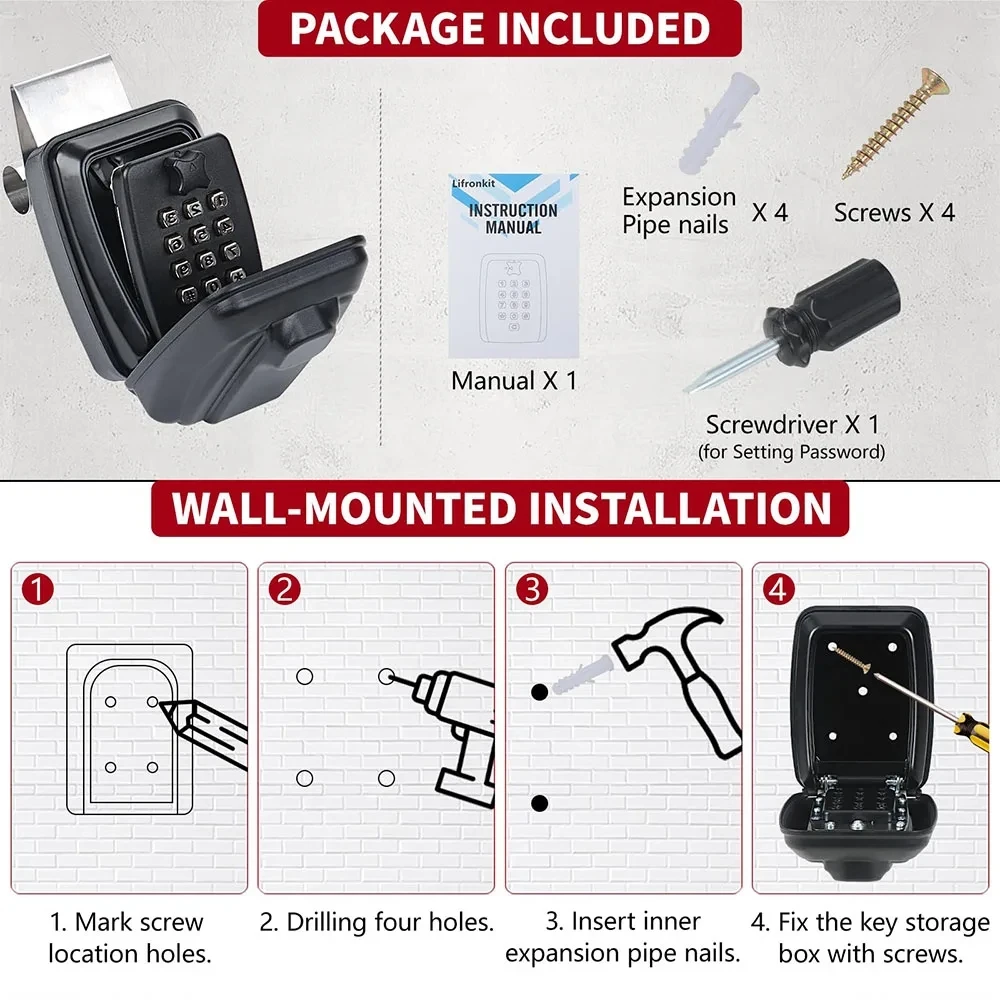 ✅【EASY TO INSTALL & USE】: The key lockbox comes with 4 screws and 4 extension wall anchors, easy to install and fix on the wall; the included small screwdriver is convenient for you to set the password, the metal button is more convenient to use and the nu