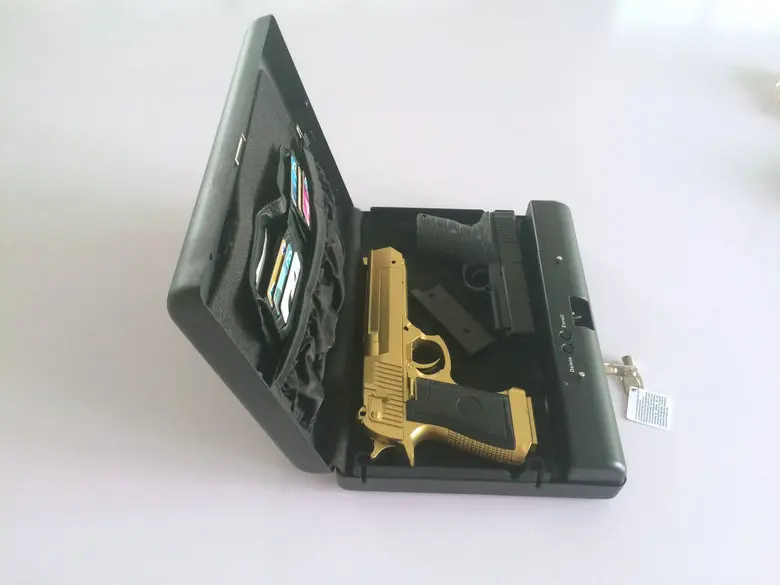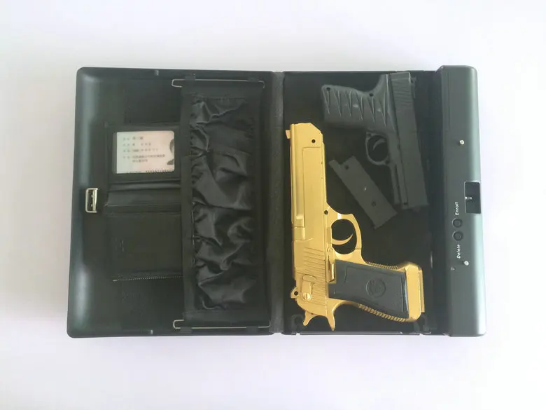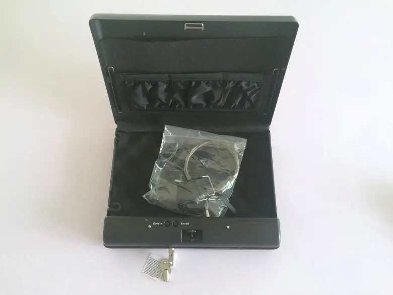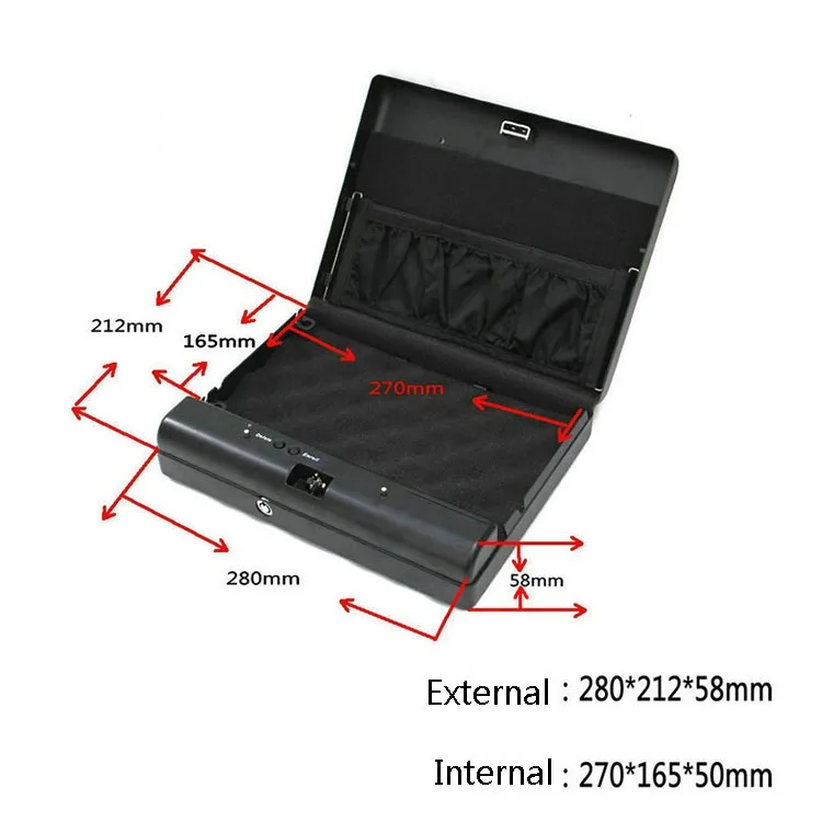 1. Size(outside): 280 * 212 * 58 mm; Size(Inside): 270 * 165 * 50 mm 2. The plate thickness and material: 1 mm cold-rolled steel sheet3. Weight: 2.5 kg/one4. Color: black5. Power Supply: 4* AA Alkaline batteries (Not included)6. Lock methods: Fingerprint lock and key lock7. Model number:OS500SDTProduct Features:1. Small and exquisite, length width is less than A4 paper, the thickness of only a bank card2. Rugged, 1mm cold-rolled steel plate, to ensure the hardness of the box, to cope with the destruction of violence3. Simple mode of operation: press the ENROLL key, and then finger brush four fingerprints, you can register successfully4. Perfect rights management: the first two registered fingerprints default for the administrator fingerprint, the third and later registration need to be authorized by the administrator5. High-quality spray treatment, give you a perfect touch experience and visual experience6. Built-in high-quality leather belt, independent folder and buffer foam pad, effectively fixed and protect your valuables
