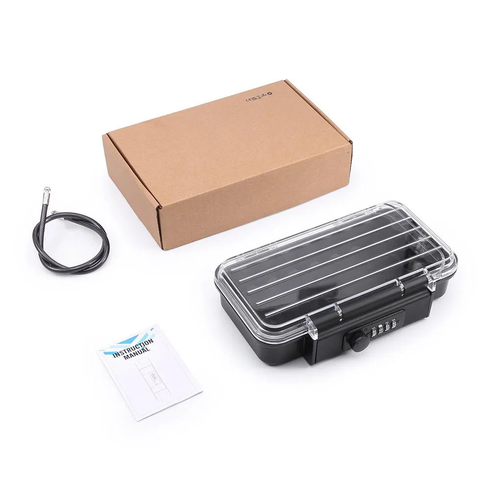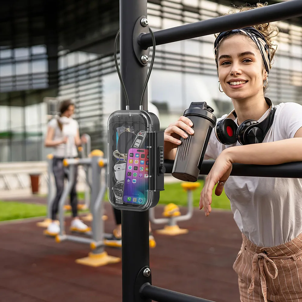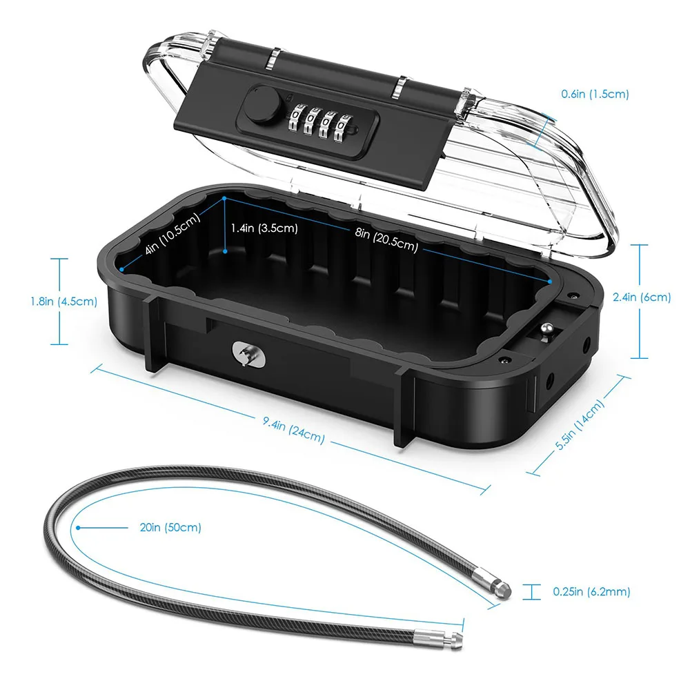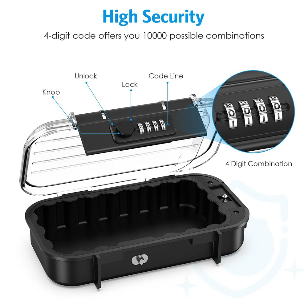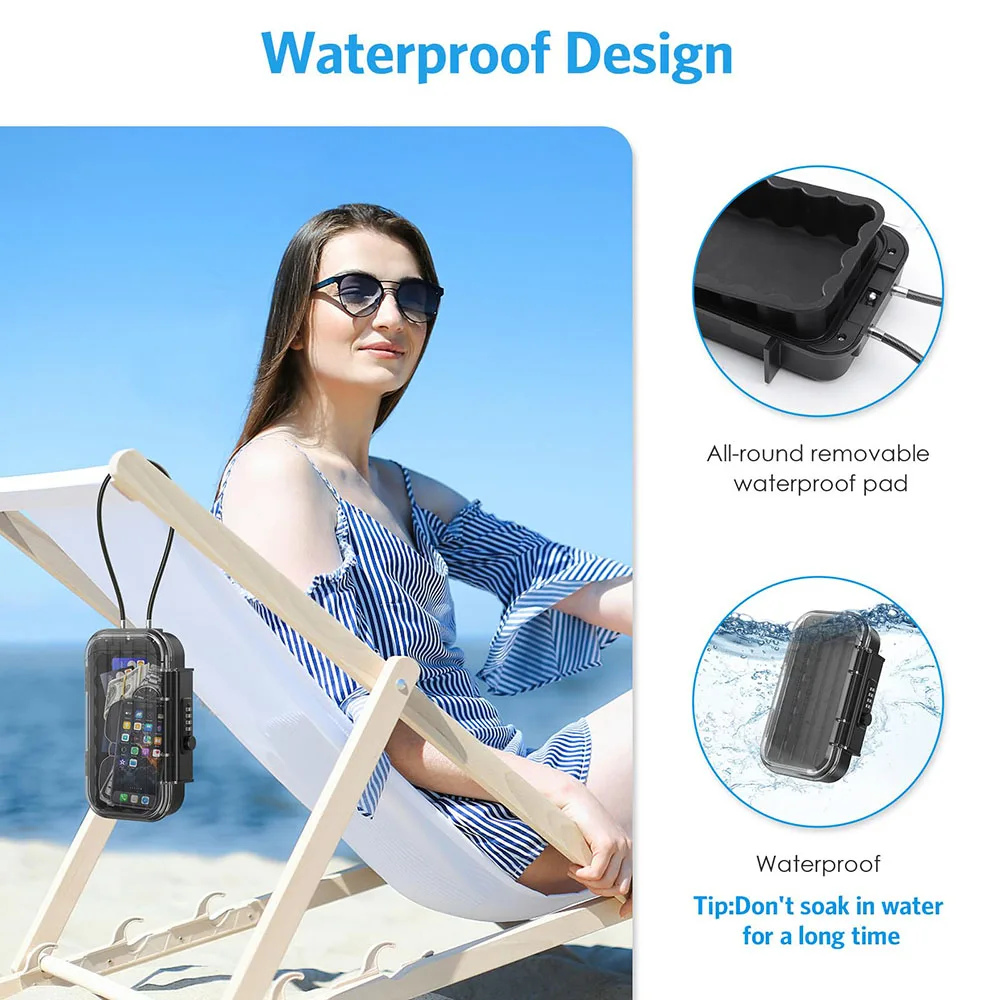 The passcode storage case has resettable 4-digit passcode which provides up to 10,000 possible combinations, the added knob switch adds one more security guarantee, the transparent design allows you to observe the interior in real time, check your cell phone phone information, financial security, and whether there's any water ingress at the beach.