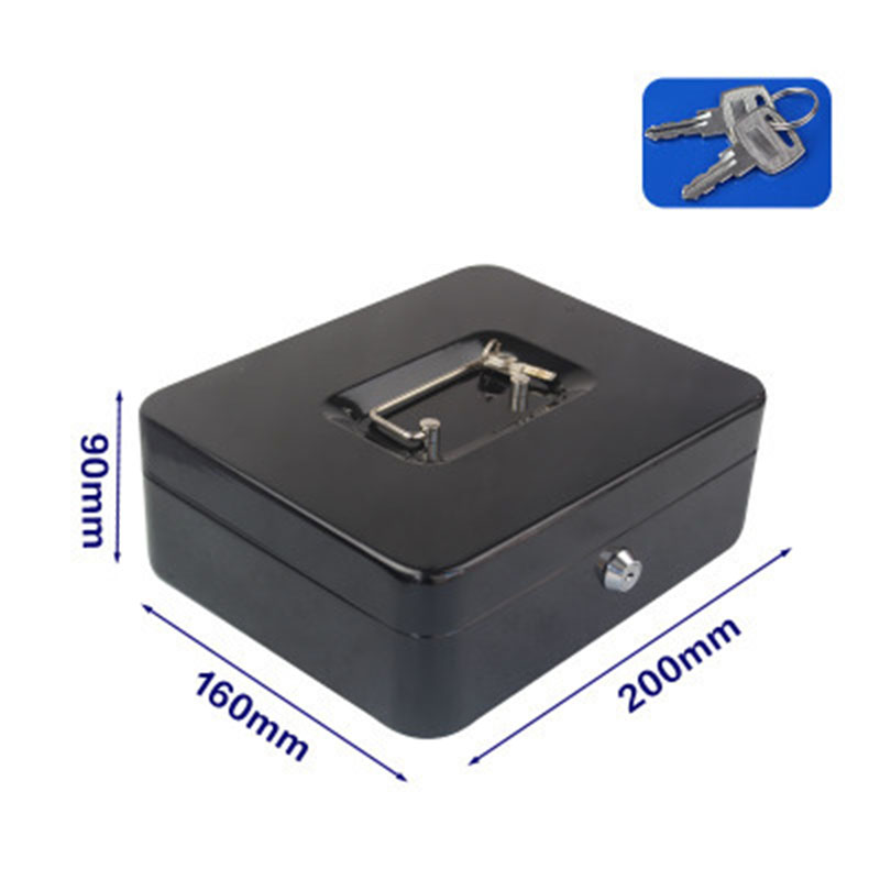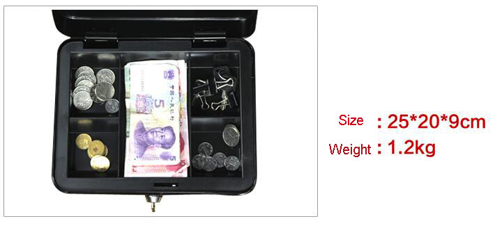 Material: Steel Plastic Product Type: Cash Box Opening method: key Function: Anti-theft and fire prevention Color: blue / red / black Size:125*95*60mm 150*120*80mm 200*160*90mm 250*200*90mm Note:all size data are measured manually, there are certain errors