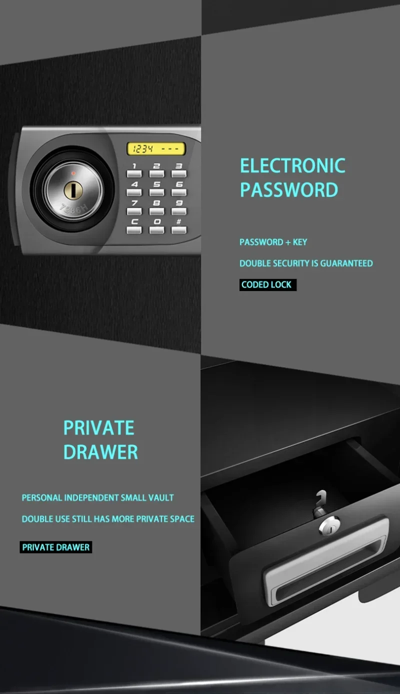 Core upgrade, sensitive anti-theft, when the safe is subjected to abnormal vibration or the wrong password is entered three times in a row, the safe will immediately send out a high-decibel siren alarm.