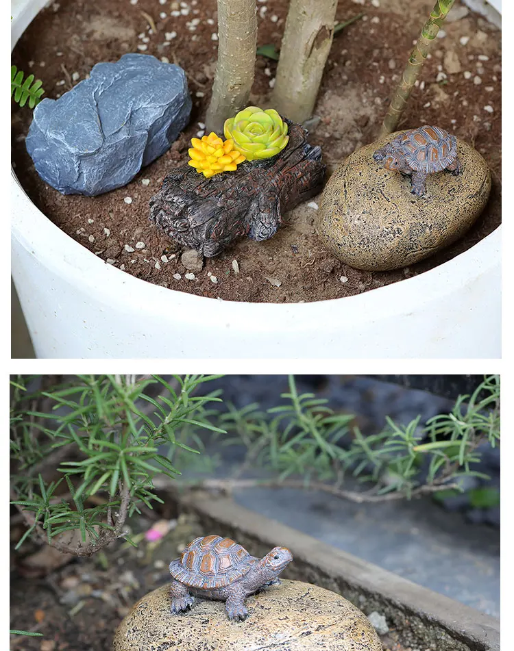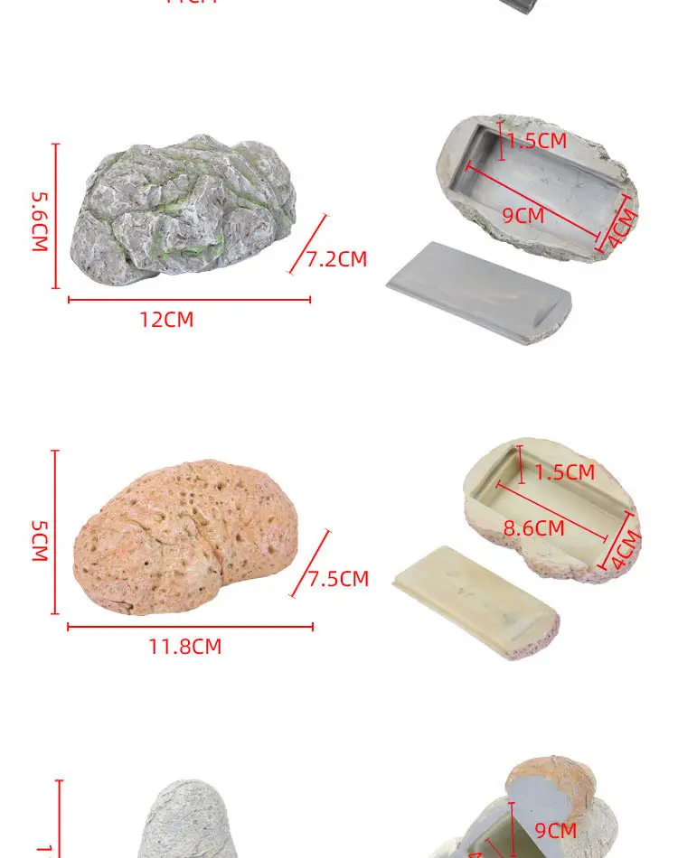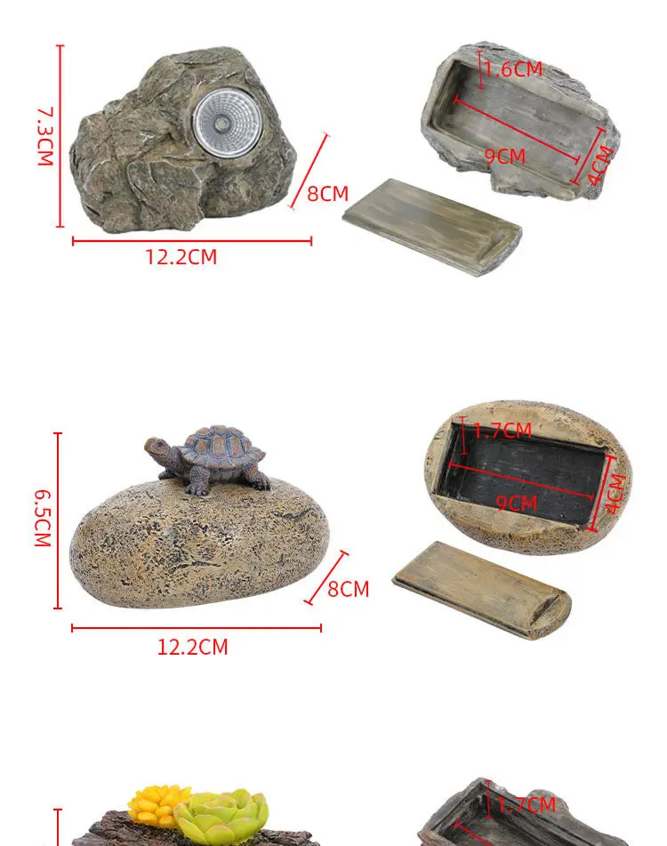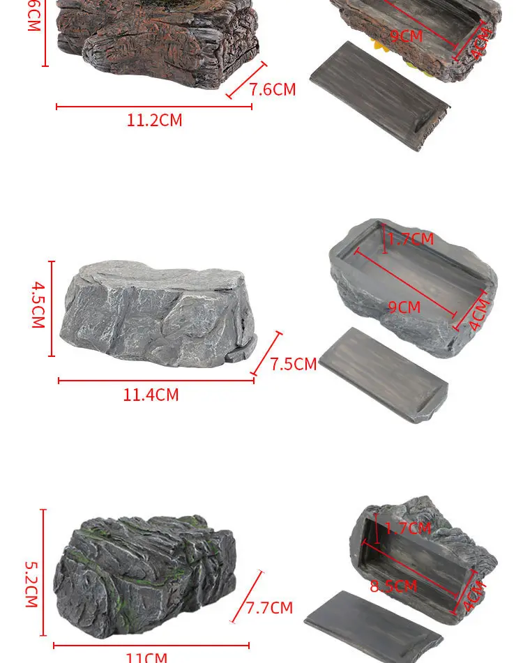 - External Size: 11.4x7.5x4.5cm (stone); 11.2x7.6x6cm (stump); 12.2x8x6.5cm (turtle)