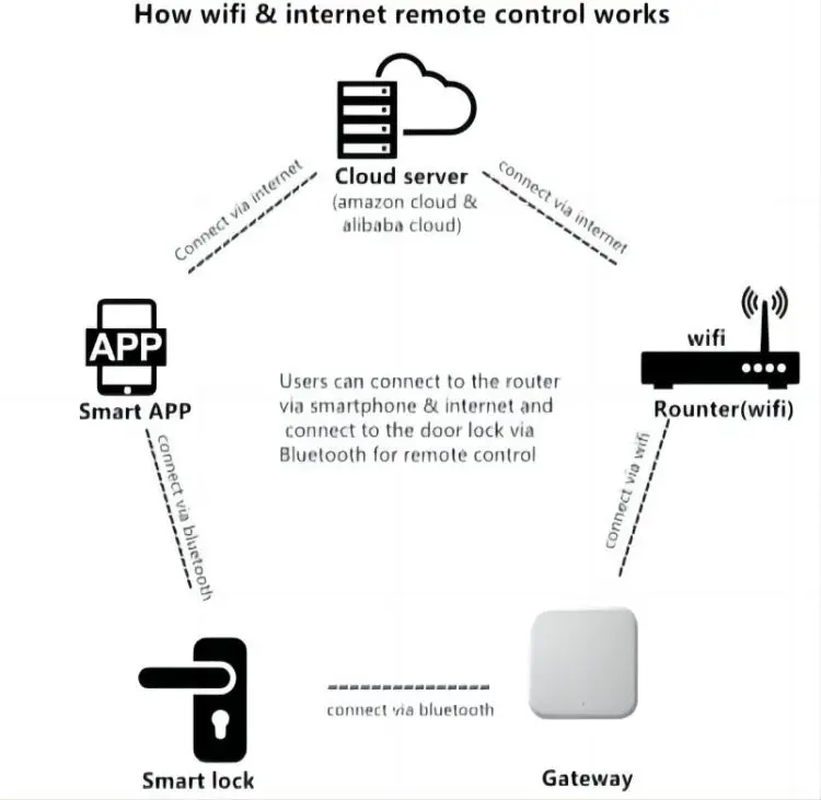 Gateway role gatewayHow the gateway works:1. Unlock remotely from anywhere in the world2. Remote issuance and deletion of IC cards and custom passwords3. Real time unlocking notifications for passwords, fingerprints, and IC cards4. Compatible with Google Home and Alexa