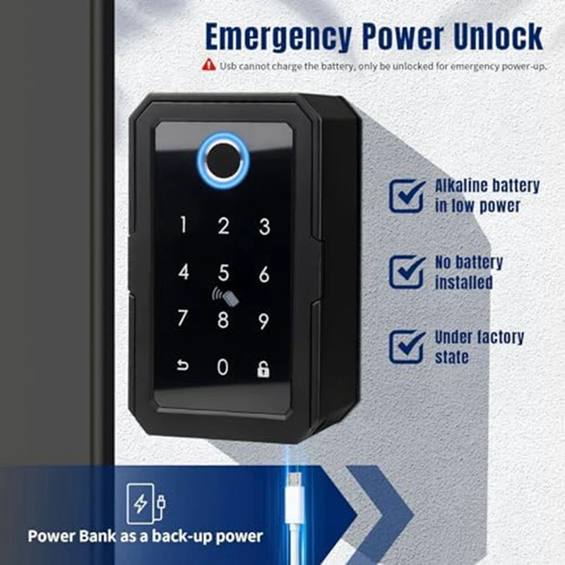The portable key lock box comes with a removable shackle and can be mounted on the wall or door handle/fence hanging, providing flexibility to install anywhere you like. Powered by 4 AAA alkaline batteries (not included), emergency unlocking via USB port.
