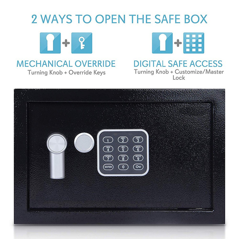 Product Description 0.8/1.7/2.1Cubic Feet Safe Box This safety box features a 0.8/1.7/2.1 cubic feet storage capacity and reliable lock systems. You can securely and quickly access the safe with a key, fingerprint, digital code, or fingerprint & digital keypad. It