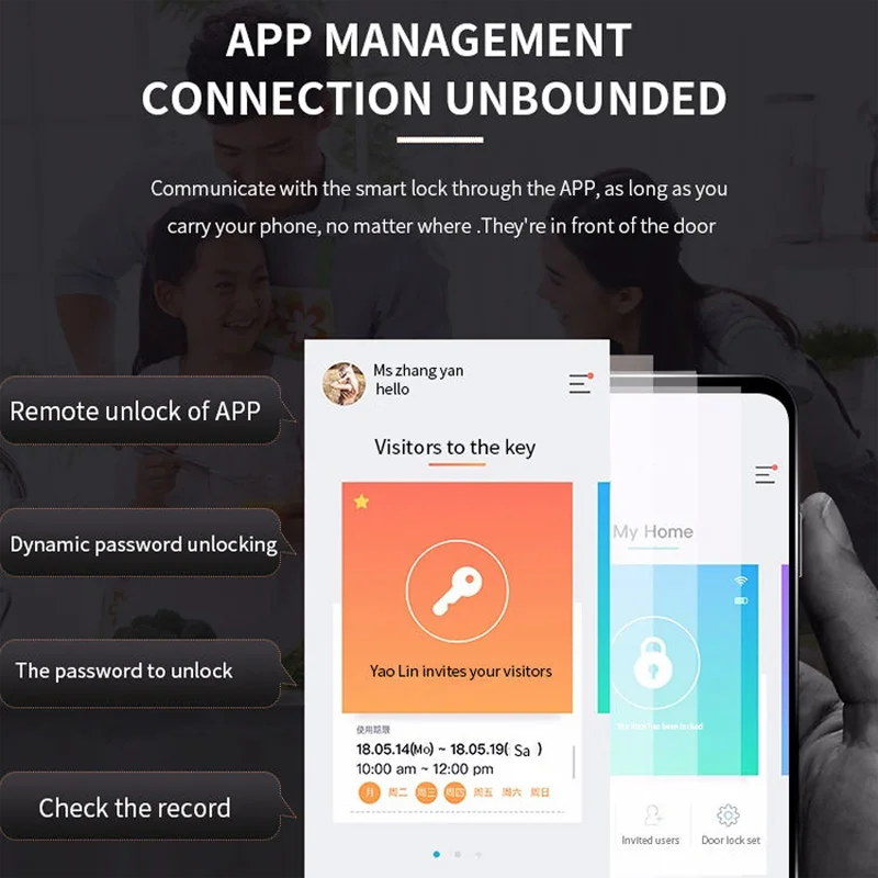 2. Smart and Reliable: Two types of pin codes - User specified password, system random password. For situation like daily use, 1-time use, recurring vistis, exact dates/times use