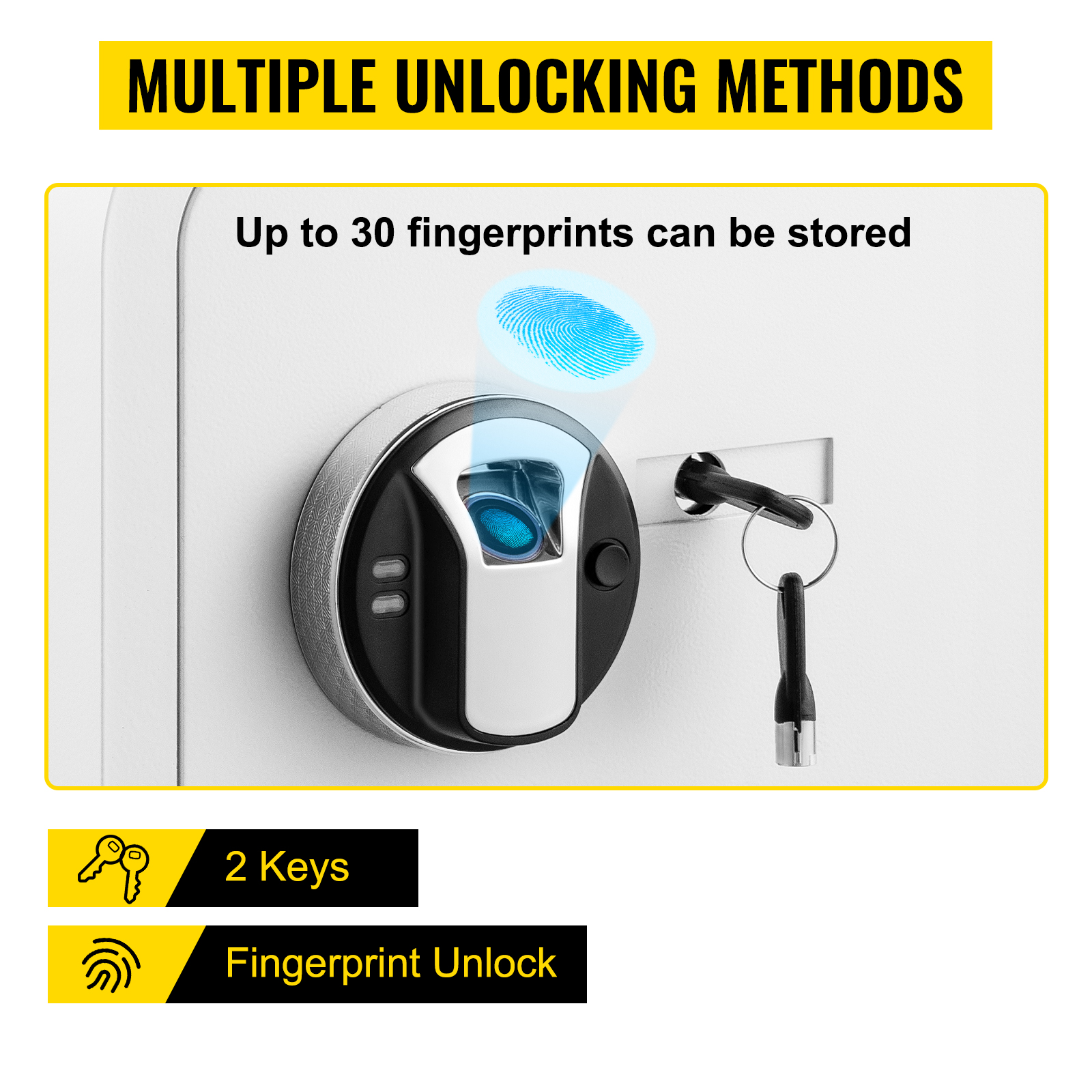Multiple Unlocking MethodsThis security safe has 2 unlocking methods available. You can use the key or fingerprint to unlock the door. Additionally, this security safe can store up to 30 fingerprints meeting your needs.