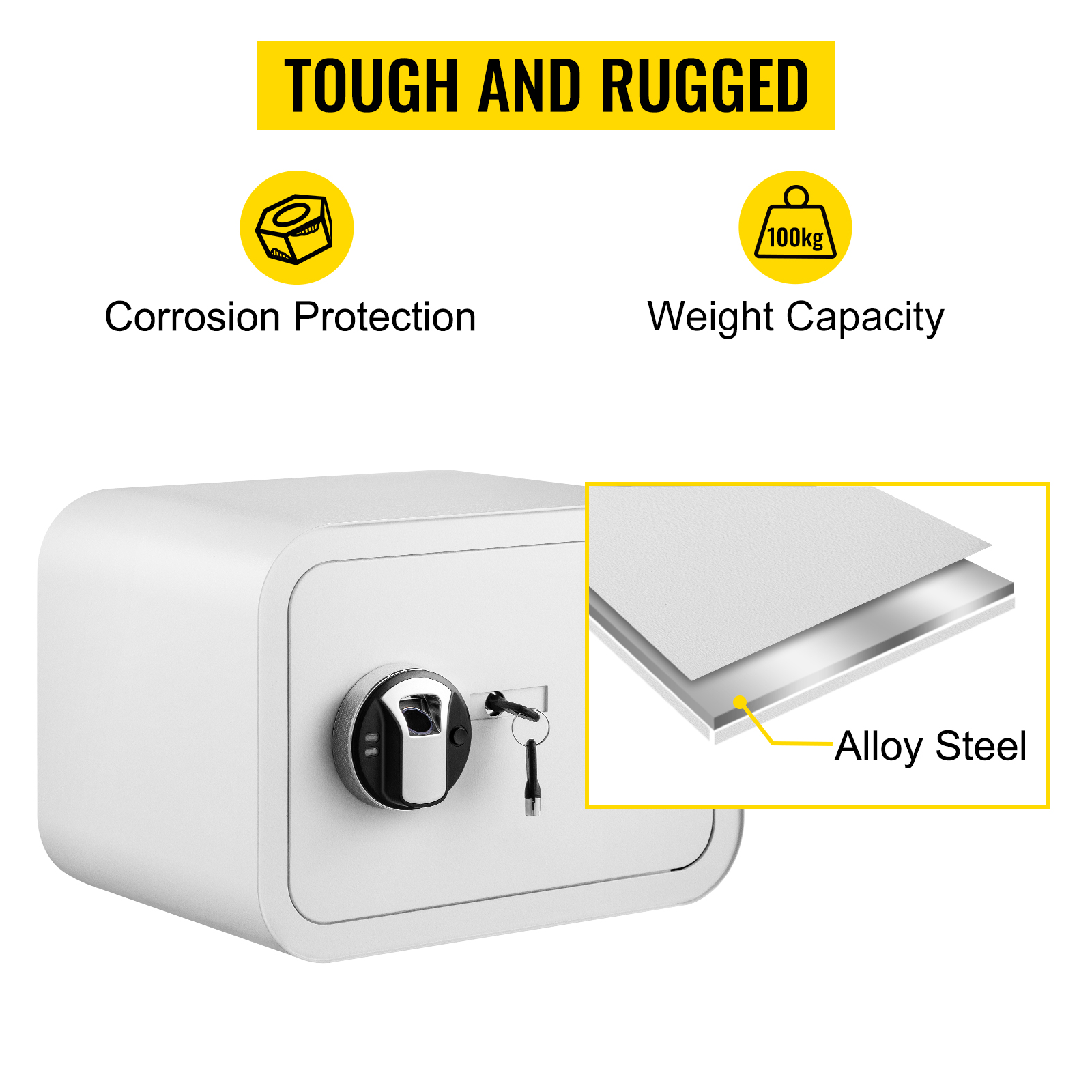Tough and RuggedThis fireproof safe is made of 1.2 mm alloy steel which is corrosion protection, and has a weight capacity of up to 220 lbs / 100 kg to store many valuables. The carpet also could provide additional protection for your things.
