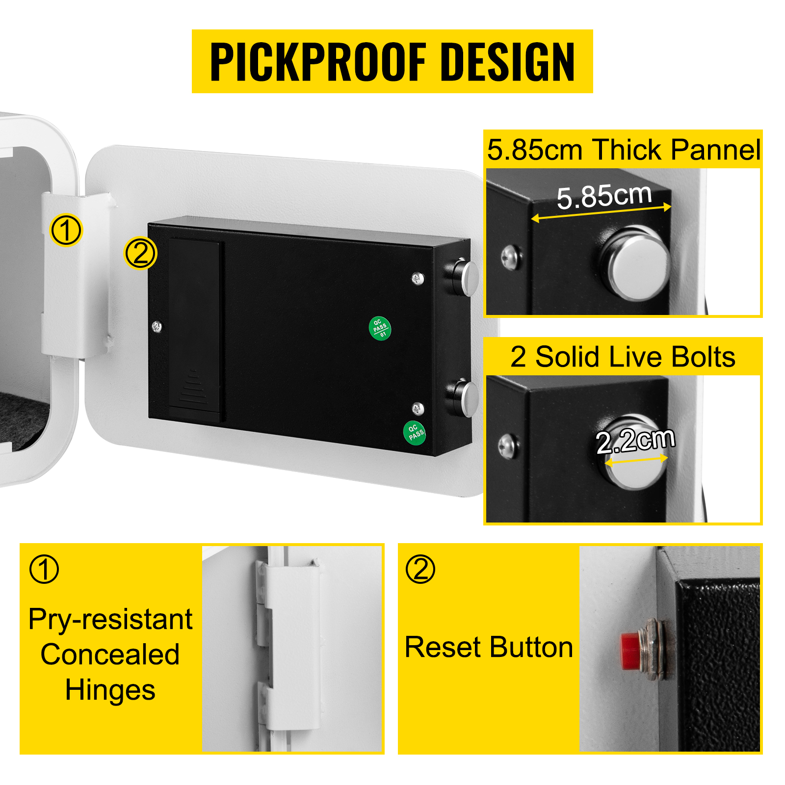 Pickproof DesignThe safe box for money is designed with a 3 mm thick door, 2 kinds of lock types, and pry-resistant concealed hinges to keep your items secure. The burglar alarm will lock the operating system when the wrong code is entered three times.