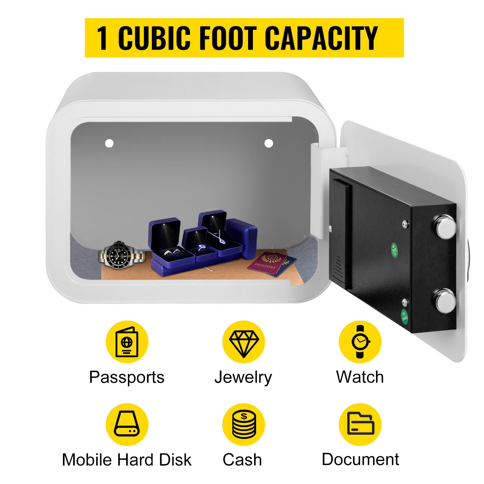 - 1/1.8 C Large Capacity: The interior of this small safe is 1/1.8 cubic feet. It can keep valuable items like passports, jewelry, watches, mobile hard disks, cash, documents safe. Rest assured to use it to store your valuables, personal information. Also, the carpeted floor inside protects items from damage.