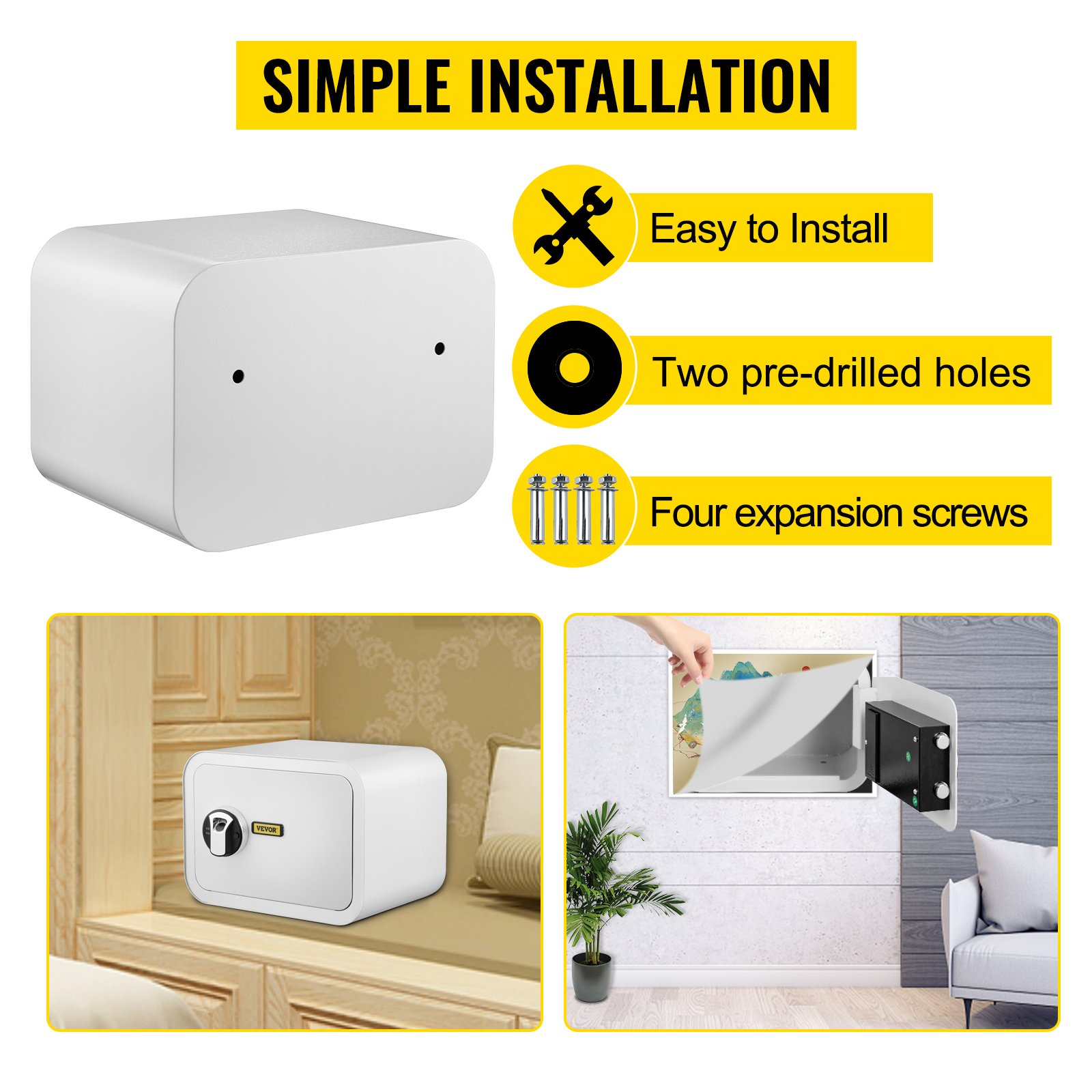 Simple InstallationTwo holes are pre-drilled on the back, and four expansion screws and tubes are included, making this security box easy to mount the personal safe to a floor, shelf, or wall.