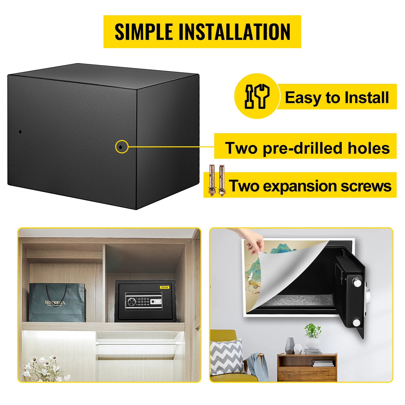 - Wall Mounted Design: With two pre-drilled holes and two expansion screws, these safes can be quickly and stably installed on the wall, floor, or shelf for extra safety, ensuring they wouldn't be stolen. The black exterior finish gives it a handsome look that coordinates with any home or office setting.