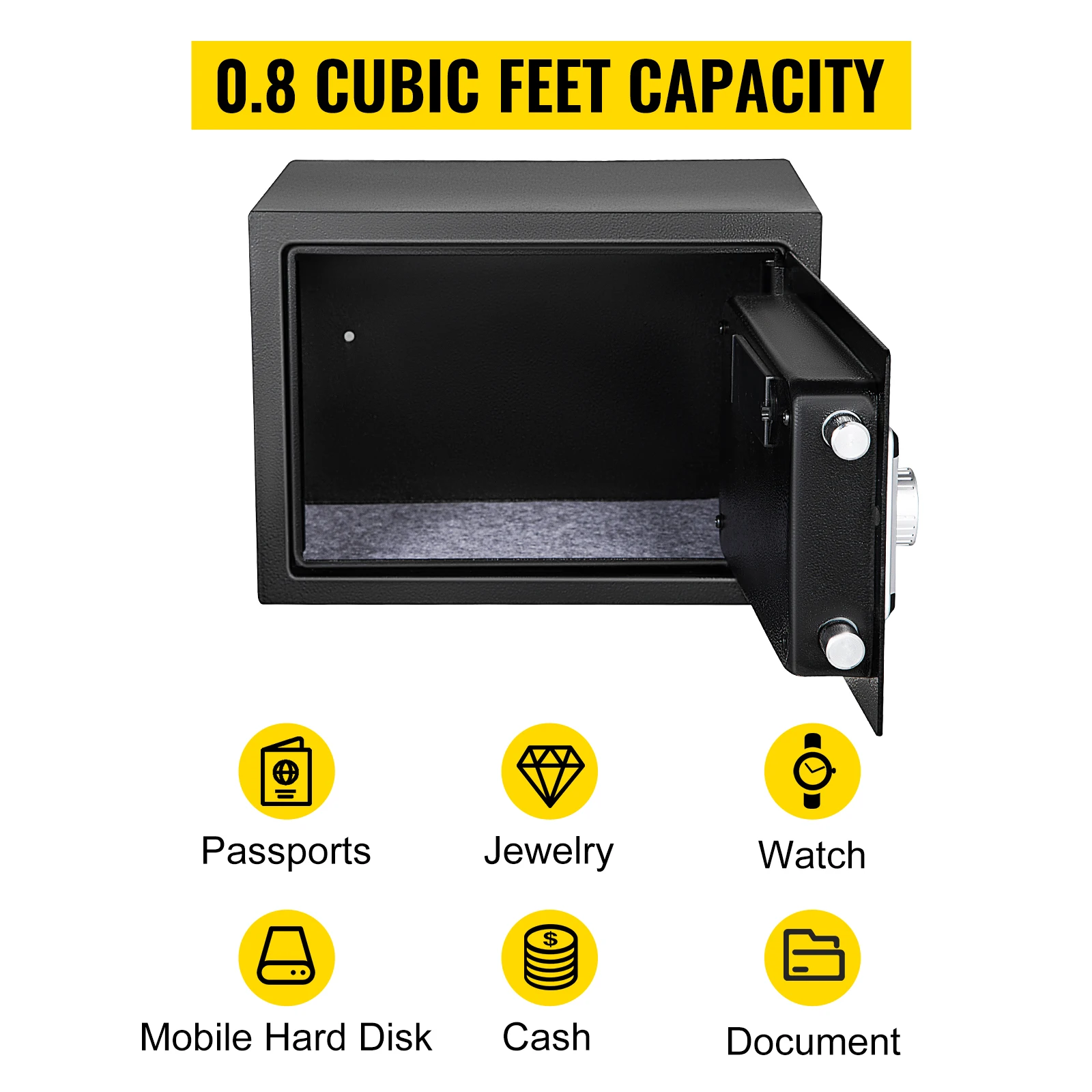 - 0.8/1.7/2.1C Large Capacity: The interior of this small safe is 0.8/1.7/2.1 cubic feet, and able to keep valuable items like passports, jewelry, watch, mobile hard disk, cash, document. Rest assured to use it to store your valuables, personal information. Also, the carpeted floor inside protects items from damage.