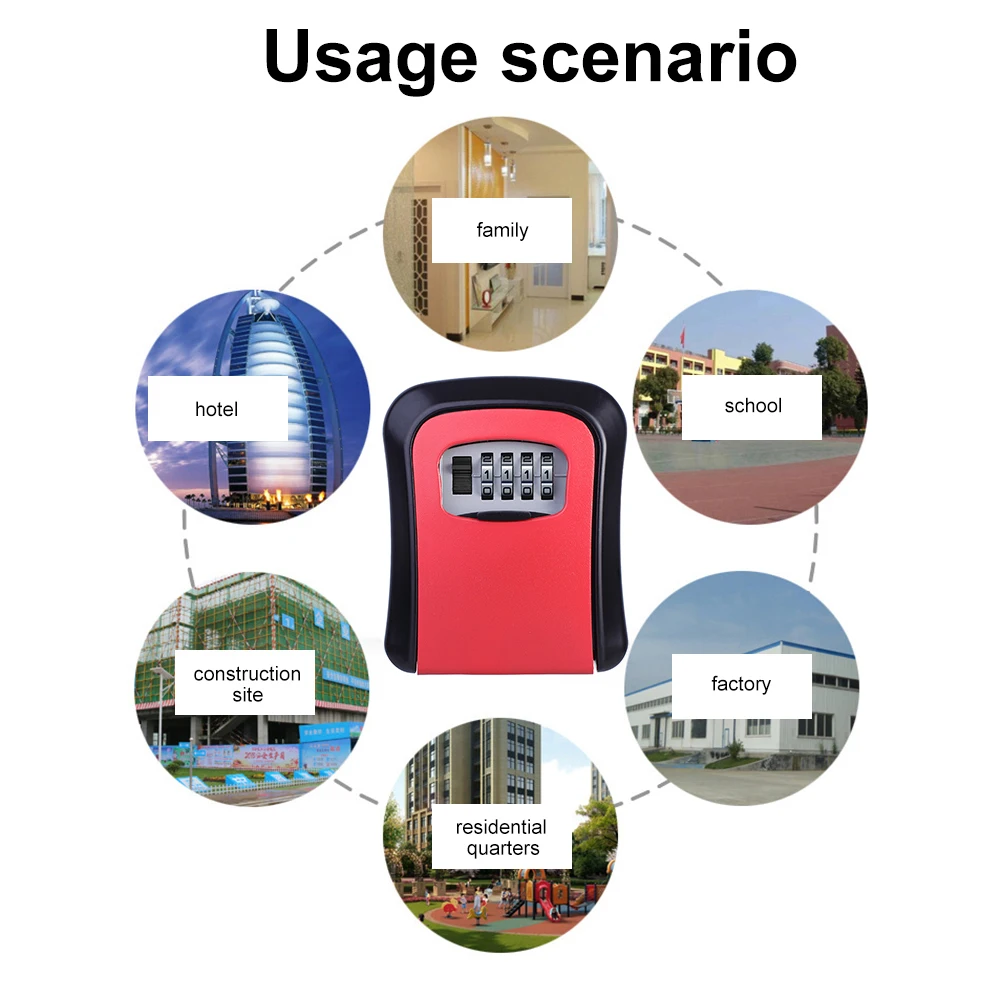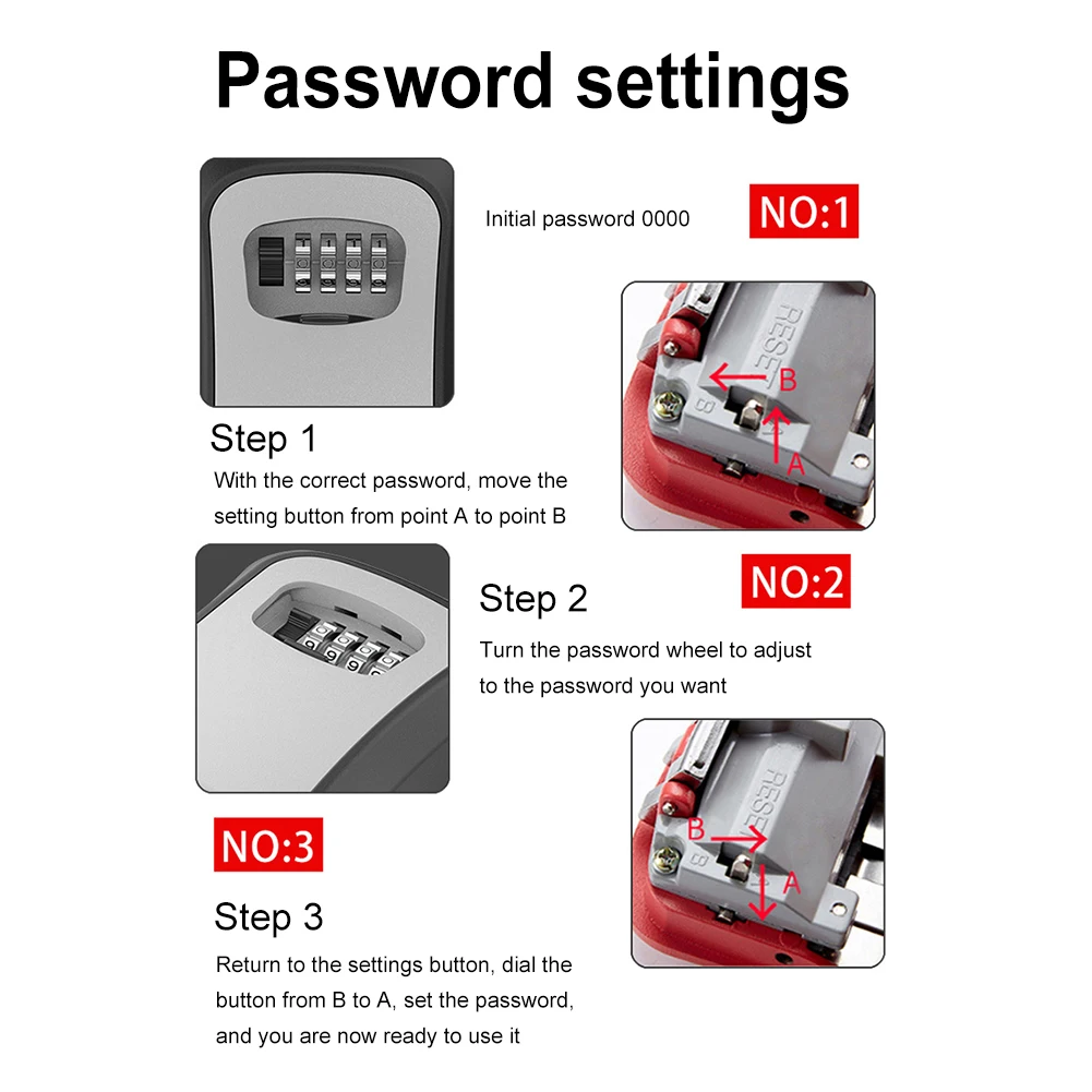 Feature: 1. Convenient and Efficient: The key box supports mechanical password unlocking with a 4-digit combination, making it easy to use without the need for charging or batteries. 2. Durable and Secure Materials: Made from high-quality engineering plastic material, the key storage box is tough and durable, ensuring that it is not easily broken into. It can safely store small items like keys and cards. 3. Versatile: Suitable for both indoor and outdoor use, this key box is perfect for a variety of settings such as construction sites, apartments, schools, homes, and offices. 4. Comprehensive Instructions: Upon receiving the key box, customers are advised to read the instructions carefully before using it. The key box comes with wall-mounted fixtures and accessories, and customers who have questions can contact customer service at any time. 5. Peace of Mind: With its secure and reliable design, this key box provides peace of mind for users who need to keep their keys safe and accessible. Specification: Certification: CE Origin: Mainland China Lock body material: ABS engineering plastic Color: Black, Red, Blue, Green, Orange (optional) Size: About 120 * 96 * 40mm/4.72 * 3.78 * 1.57inch Weight: 0.2KG How to correctly open the keybox: 1. Pull down the black waterproof and dustproof cover to see the password wheel and opening button 2. Turn the password to 0-0-0-0 (the factory password for the keybox is 0-0-0-0) 3. Press the open button and keep it pressed down. Pull the box cover outward to open it 4. Close the lid of the box and dial the password to lock it. How to set a password: 1. The RESET position is to set the button position from A to B (Figure 1) 2. Turn to the desired password by dialing the password (Figure 2) 3. Reset the setting button from B to A (Figure 3) 4. Special reminder: After setting up, do not immediately disrupt the password. First, dial one digit to test whether the password set is correct. Note: