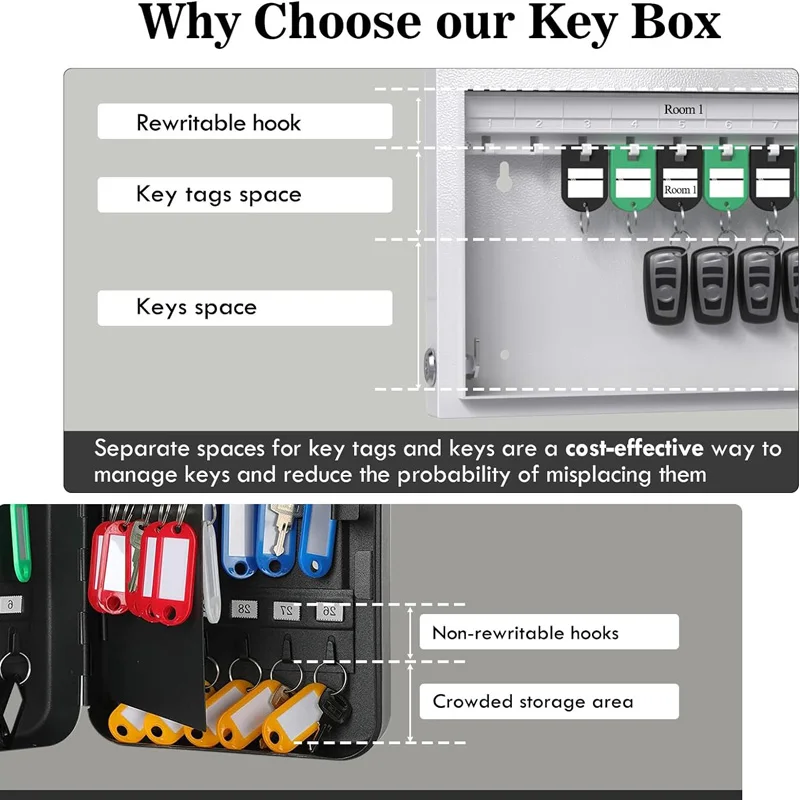 #Key Cabinet is durable & lockable.#Pre-drilled holes allow the lock box to be mounted directly to a wall#Free colored Key Tags