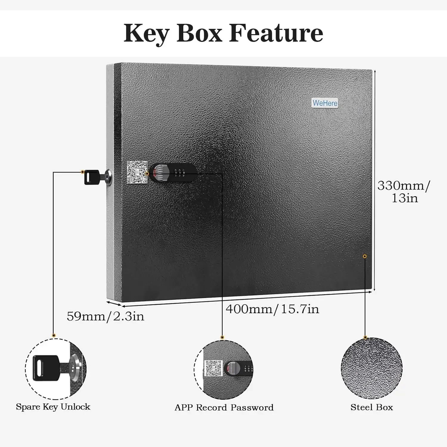 The keybox is equipped with a combination lock and a traditional lock to increase security. Users can choose their preferred unlocking method, and the accompanying application provides a secure way to record and remember a combination, ensuring peace of mind.